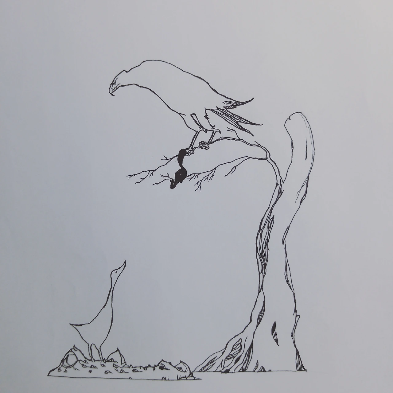 그렇지만 이 둘은 서로의 상냥함과 부드러움에 놀라면서-다람쥐와 오리 둘 다 악어와 독수리가 이렇게나 상대에게 친절하다는 것을 전혀 몰랐던 것입니다-동시에 서로에게 빠져들었습니다. 그래서 매 달, 달이 뜨지 않는 그믐밤이면 그 둘은 갈대밭에서 깊은 이야기를 나누곤 했습니다. 그 둘은 서로의 모습을 궁금해 하였습니다. 그렇지만 그믐밤이 아닌 시간에 만나는 것은 자신의 목숨을 보장받지 못할 것이 분명하였으며, 또한 그렇게도 당당한 상대에게 자신의 거짓말과 초라함을 들키는 것이 창피하였기 때문에 그 둘은 다른 약속을 잡지 않았습니다.