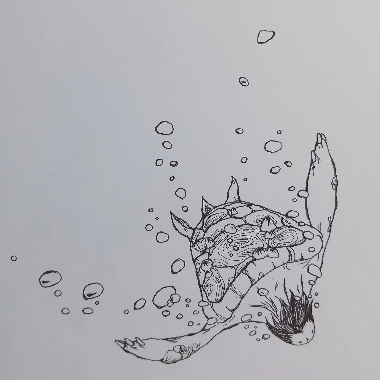 거북이는 알라의 궁전을 나서며 더 이상 고양이를 보지 못한다는 슬픔에 그만 발을 헛디디고 말았습니다. 알라의 궁전에서 바다로 떨어지는 거북이의 발은 노처럼 편평해지기 시작했습니다. 그리고 바다 깊숙이 가라앉아버렸습니다.