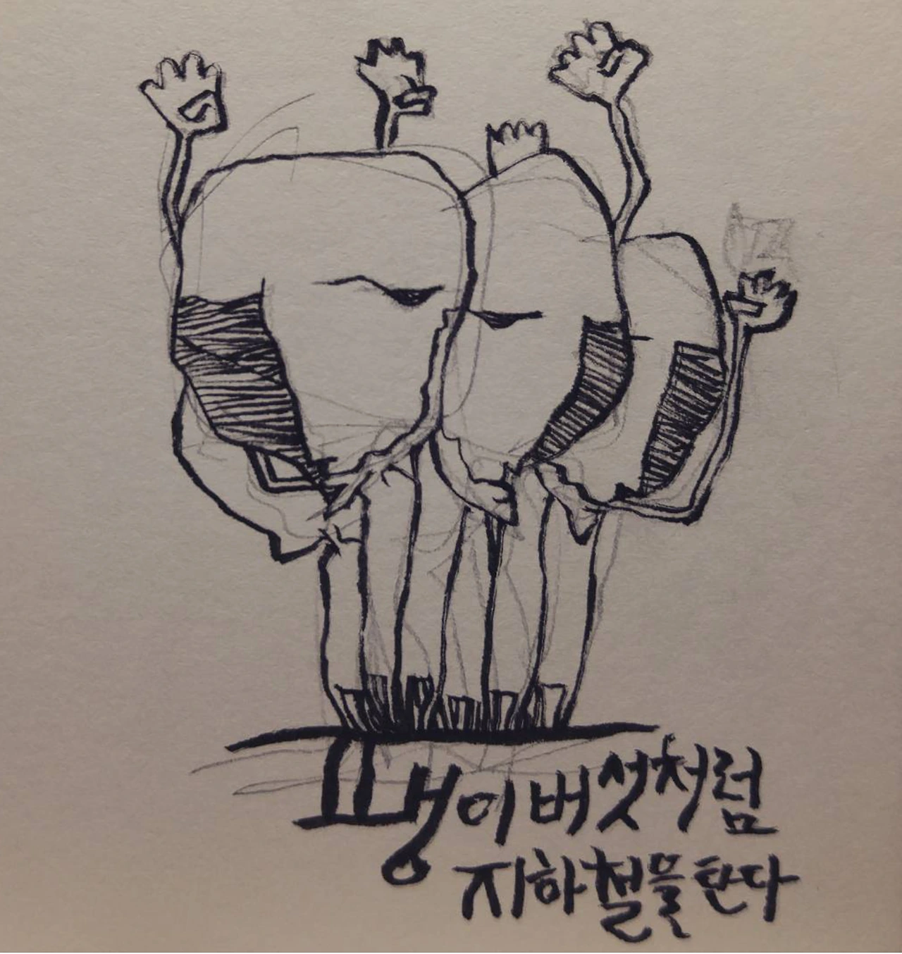 지하철을 타는 것은 사는 일이다. 나는 백면서생 같은 이라 지하철을 타면 글을 읽고자 하고 그도 아니거든 사람들을 그려보려 애쓰고 때로는 군인이나 노인에게 자리를 양보하려 해보지만 출근길과 퇴근길의 전철은 내 자리를 지키는 일 외에 어느 것도 할 수 없다. 이들은 먹고 사는 일터로 가고자하거나 또는 그 일터로 가는 길을 쌓기 위해 이 지하철을 탔고 그렇기에 이 것은 사는 일과 같기 때문이다. 어떤 이는 앉기 위해 다투고 어떤 이는 짐을 지키기 위해 다투고 또 어느 이는 늦지 않기 위해, 그저 지하철에 몸을 싣는 것만을 목적으로 지렛대처럼 사람들과 지하철 문 사이로 제 몸을 밀어넣는다. 그러나 그러한 짓은 또 그 다음날이면 반복될 것이기에 그는 가장 처량한 시지프스와 같으며 또 그런 그를 보며 눈쌀을 찡그리는 우리는 지옥의 또 어떤 사물들과 같다. 지하철을 타고 자리에 앉아 편히 가는 일은 나의 노력과 비례하지 않는다. 그럼에도 우리는 불평보다 묵묵히 몸을 지하철에 싣는 것으로 대답한다.