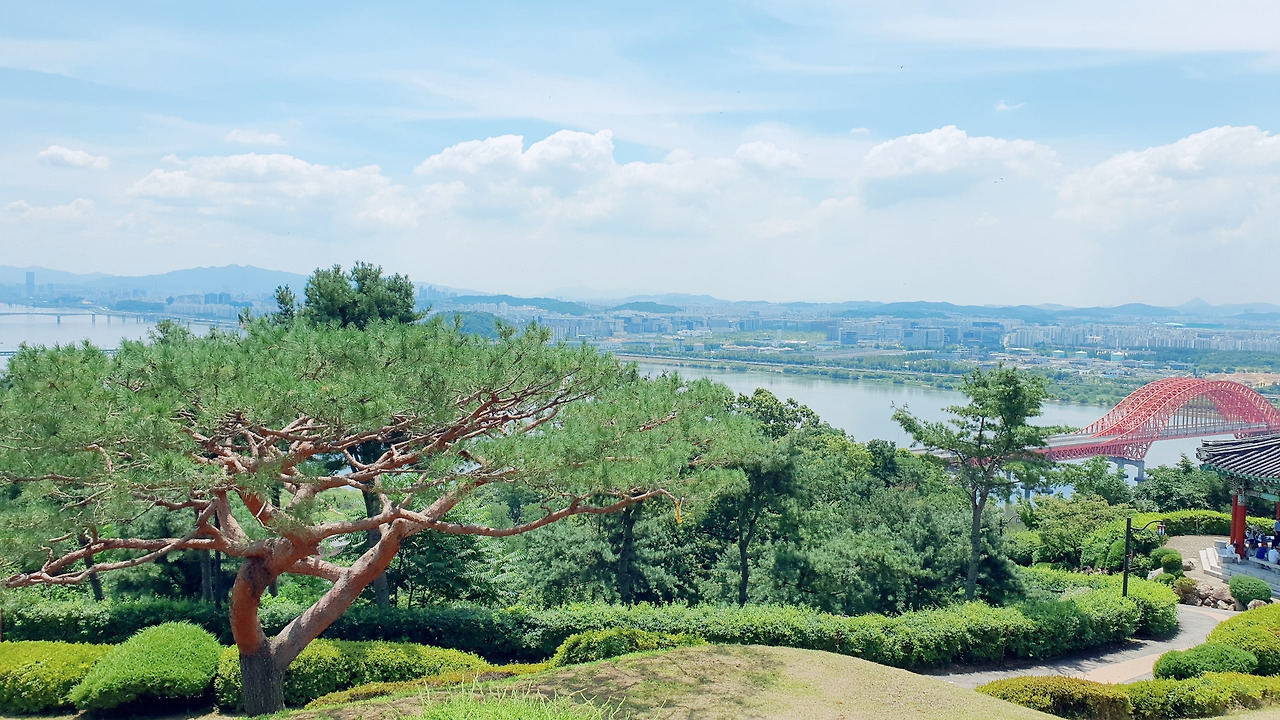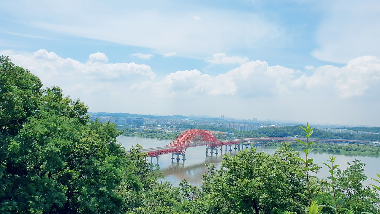 행주산성은 꽤 잘 정비되어 있었다. 권율 장군의 동상이 보였다. 그 옆으로 넓게 뻗은 길이 보였다. 우거진 숲길도 있었다. 숲길에서는 청설모가 우리를 반겨주었다. 우거진 나무 사이로 하늘이 예뻤다. 산성 위에서 아래로 굽어보았다. 한강이다. 조경된 나무 사이로 보이는 한강도, 막 자란 나무 사이로 보인 한강도 모두 시원했다.