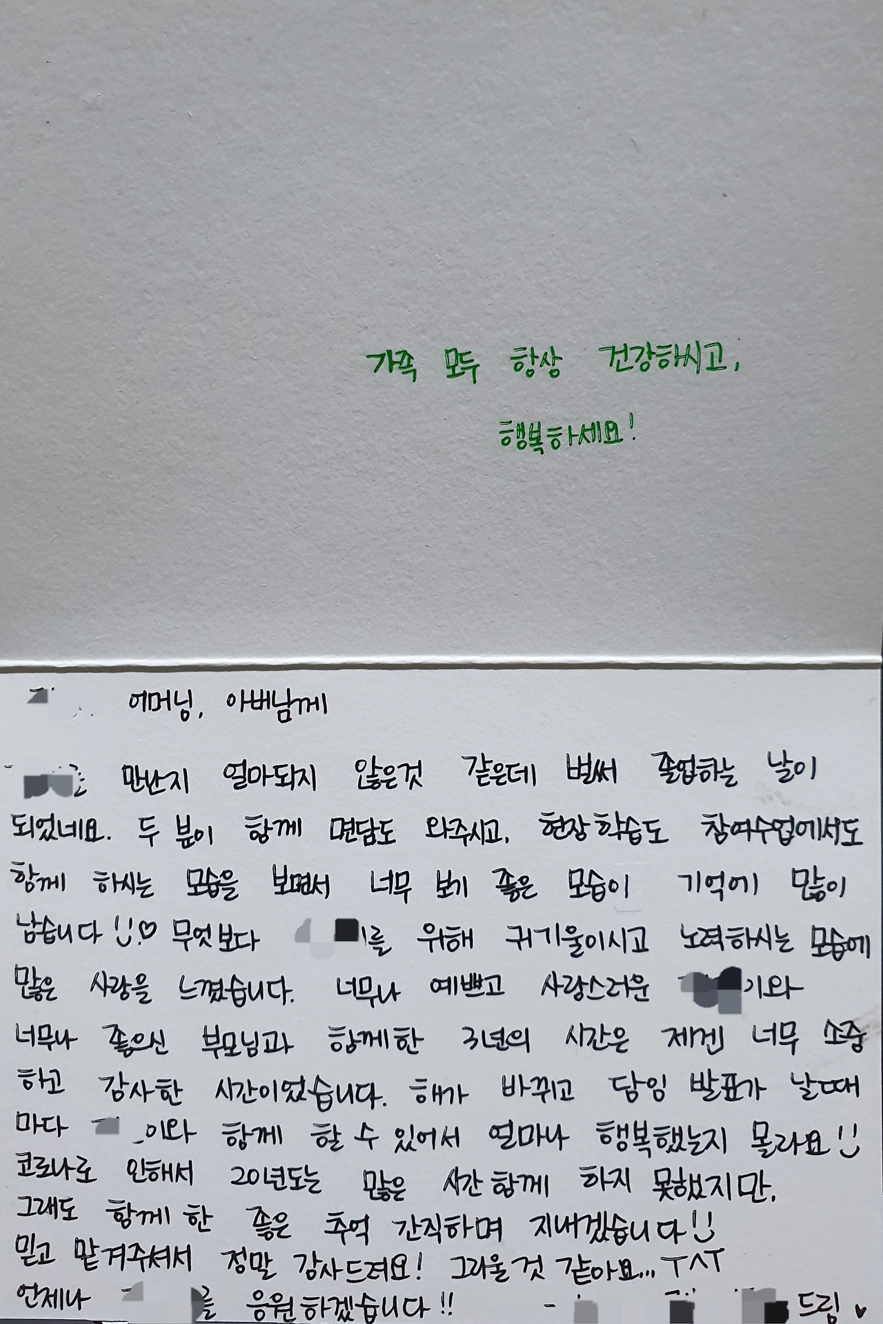 선생님을 만난 3년이 저희에게 더욱 소중한 시간이었습니다. 세상이 장애에 대해 가진 편견만큼이나 나도 세상에 대한 편견을 가지고 있었다는 사실을 깨달았습니다. 모두 선생님의 따뜻한 사랑 덕분입니다. 선생님의 사랑이 앞으로 우리 가족의 평생을 지켜줄 것 같다는 생각을 해 봅니다. 어쩌면 처음으로 느껴 본 종류의 사랑이 아닐까도 생각해 봅니다. 우리 가족에게 웃음을 가져다주신 분, 안심을 가져다주신 분. '주~'선생님, 진심으로 고맙습니다.