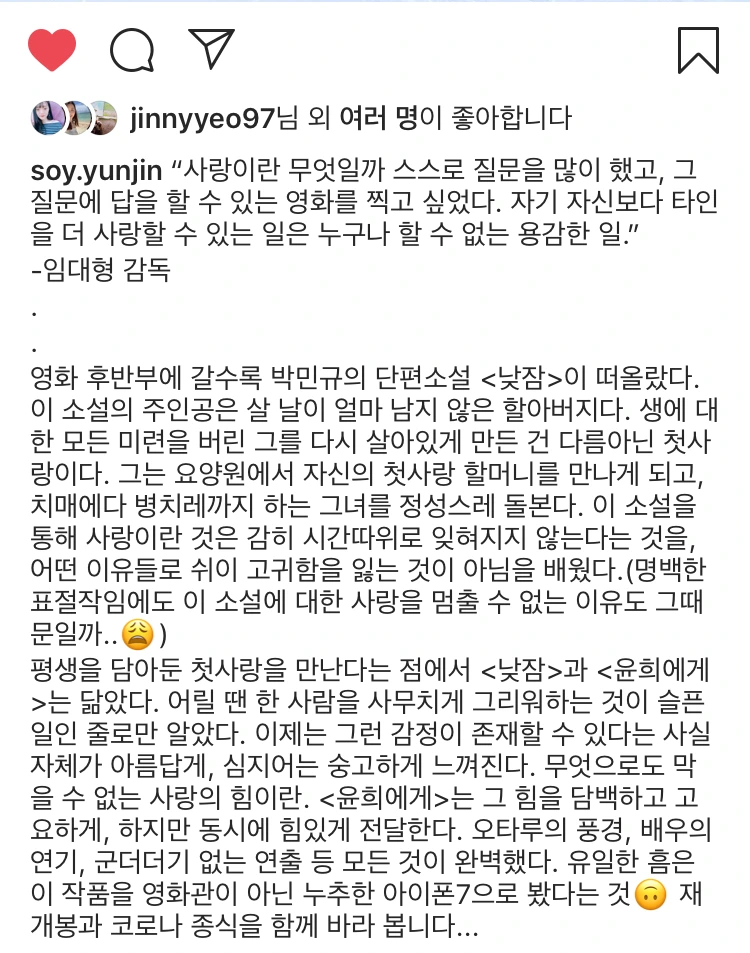 낮밤이 바뀌어 잠이 안 오는 날엔 영화를 본다. 추천을 받아 본 ‘윤희에게’가 오래 기억에 남는다. ‘이루지 못한 사랑’이 주는 무게와 아픔의 크기를 다시 한번 가늠해본다. 싫으면서도 좋은 아득한 기분.