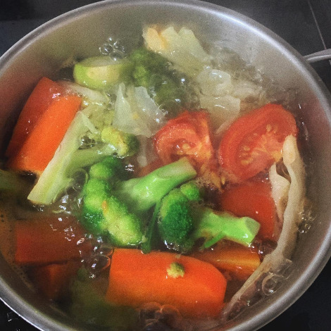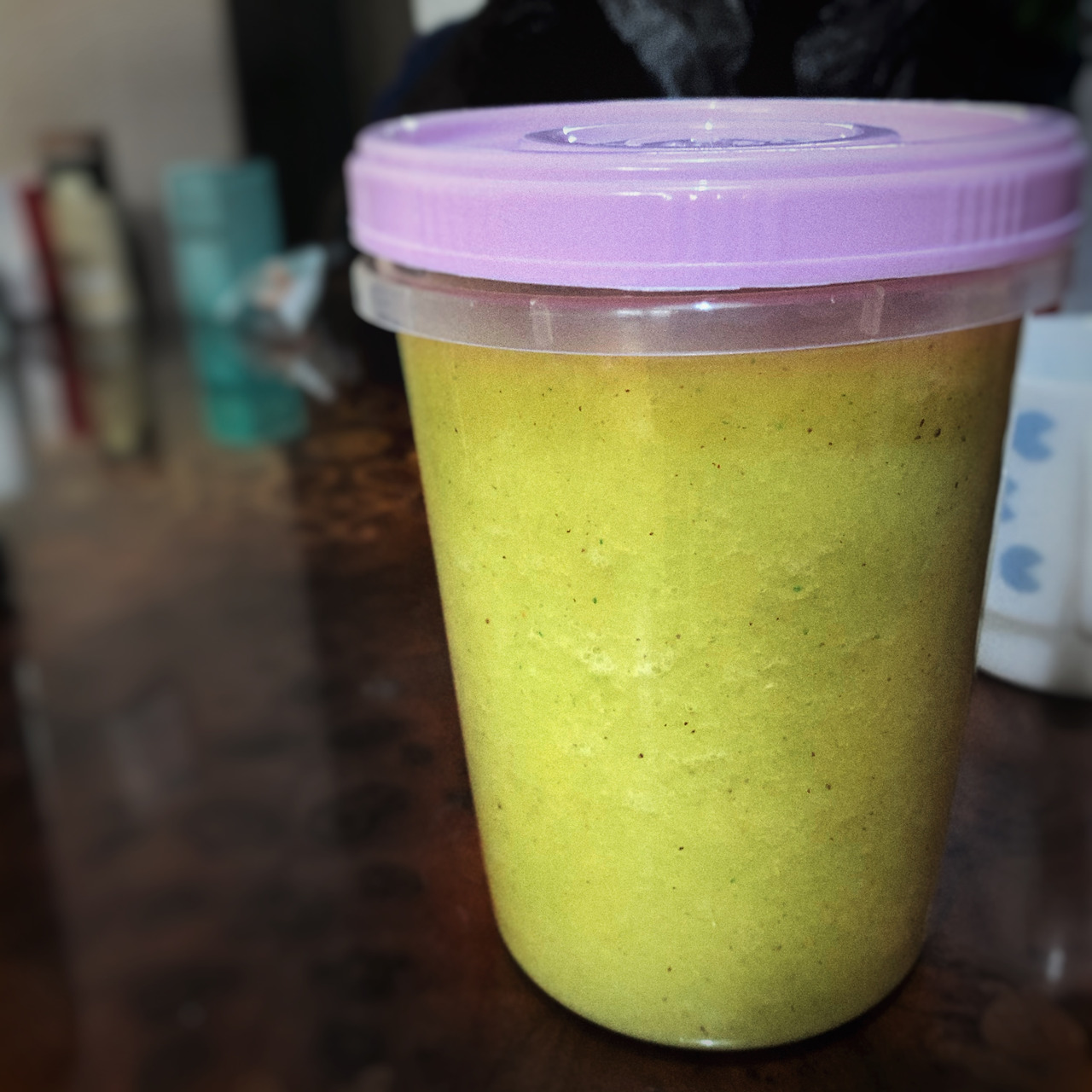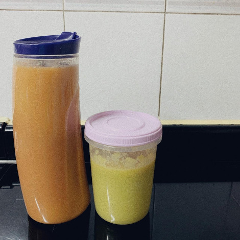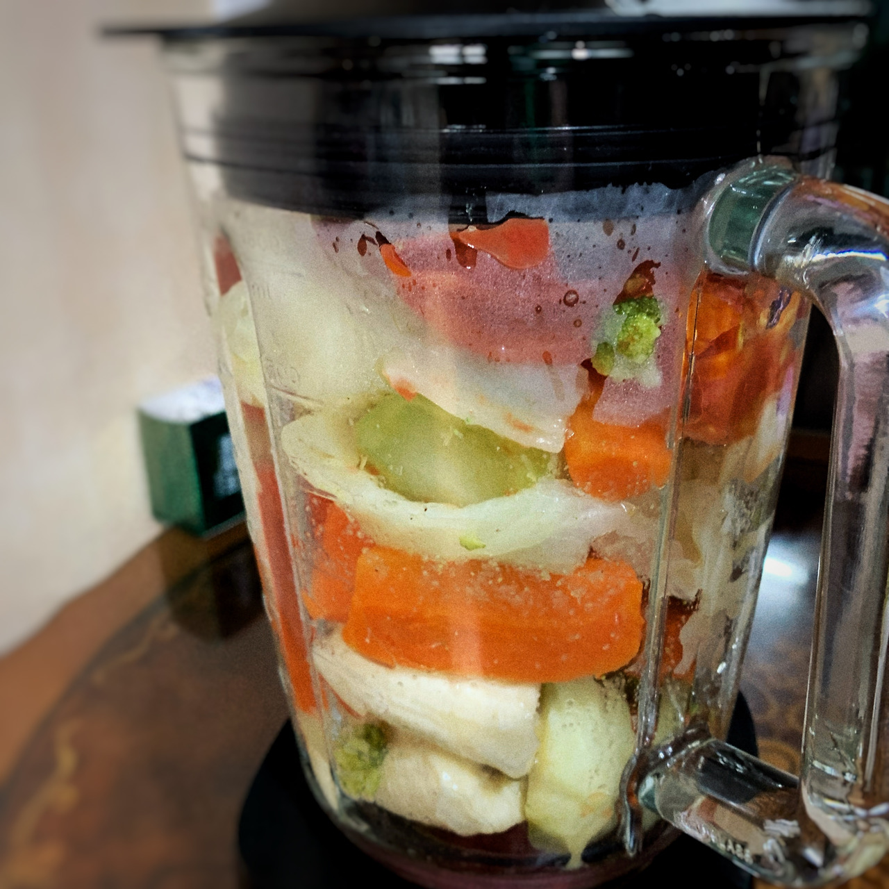 삶고 남은 물을 버리고 열을 식혀냈다. 모든 재료 준비를 마친 후에, 진공블렌더에 넣고 물을 적당히 부어서 30초 정도 갈아냈다. 과일의 경우, 씨나 겉껍질은 다 제거하였고 채소의 경우 삶아서 흐물해진 터라 너무 오래 갈아내면 씹히는 맛이 적을 것 같았다. 적당히 갈아낸 후, 통에 따로 담았다.