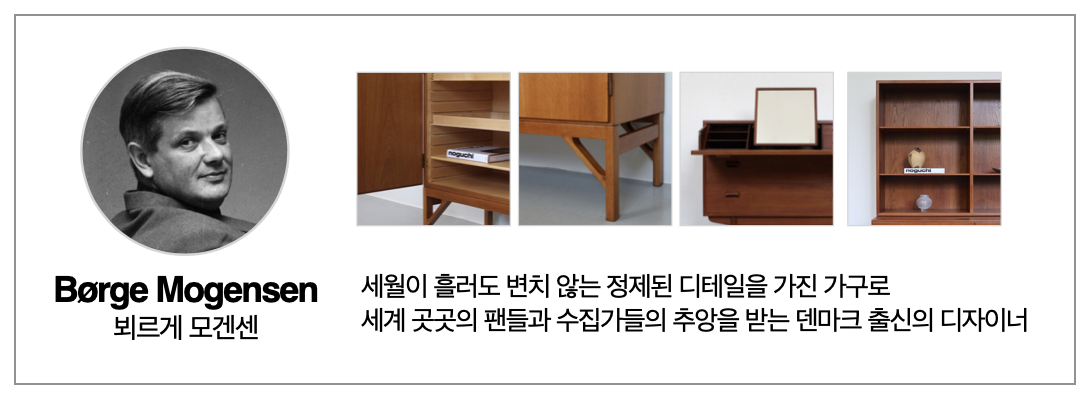 저는 한 명의 인물, 덴마크 출신의 디자이너 '뵈르게 모겐센'을 브랜드 모티프로 설정했습니다. 뵈르게 모겐센의 가구는 티크 원목을 소재로 합니다. 티크 원목은 가공이 어렵고 가격도 비싸지만 내구성이 좋은 덕에 오랜 시간 사용해도 문제가 없죠. 그리고 완성된 그의 가구는 세월의 영향에서 비교적 자유로운 정제된 디테일을 가지고 있습니다. 이와 같은 요소들이 제가 설정한 브랜드 핵심가치와 결을 같이 한다고 느껴졌습니다.