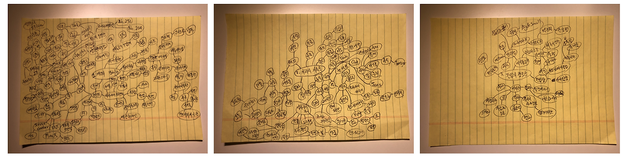 두 가지 규칙 안에서 발산형 사고(마인드맵), 수렴형 사고(카테고라이징) 2가지 단계를 통해 브랜드 네이밍을 진행했습니다. 매력적인 결과물을 얻기 위해서는 사고의 시간이 필요하고, 그 시간을 좀 더 효율적으로 보낼 수 있는 방법은 발산형 사고와 수렴형 사고의 두 단계를 충실하게 수행하는 데에 있다고 생각합니다.