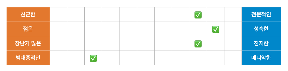 긴 시간을 고민하지 않고 브랜드의 첫인상을 기준으로 체크하시길 바랍니다. 이 퍼스널리티 슬라이드는 브랜드 완성 이후에 브랜드의 지향점을 다시 한 번 되새길 수 있는 나침반 역할을 하기도 하니 건너뛰지 않고 꼭 체크해보세요!