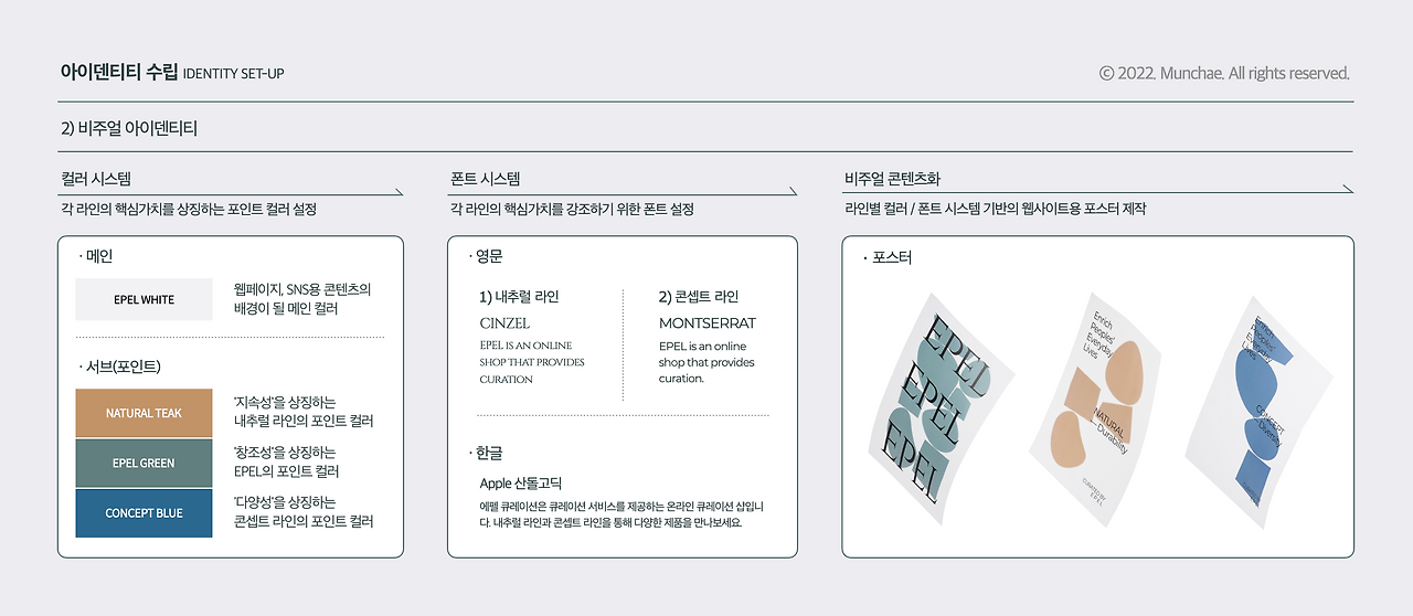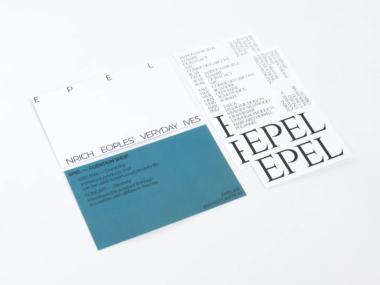리빙 오브제 스튜디오 에게 ‘디자이너 가구’가 있다면, ‘EPEL’에게는 디자이너 의류’가 있다. ‘개인의 정체성’과 ‘가치의 지속성’을 충족하는 동시에 브랜드의 큐레이션 역량, 브랜드 로열티를 극대화해야 한다. 리빙 오브제의 주 재료가 되는 ‘원목’이 가지는 질감을 베이스로 비주얼 아이덴티티를 수립할 예정이다.