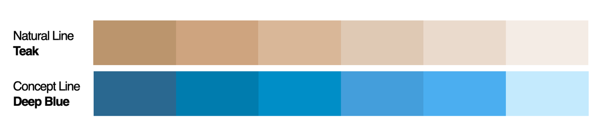 콘셉트 라인은 앞서 이야기 한 바와 같이 큐레이션의 창의성이 강조될 수 있는 컬러 선정이 필요했습니다. 신선함과 자유로움, 유연함의 감정을 느낄 수 있는 동시에 먼저 설정한 내추럴 라인의 '티크 컬러'와 융화될 수 있는 컬러가 필요했죠. 때문에 색상환을 기준으로 '유사색' 계열로 후보군을 추리고 고민했습니다. 티크 컬러는 녹색 계열이고 녹색의 유사색 계열에는 바다색, 청록색, 녹색, 풀색, 연두색, 노랑연두색 등이 있습니다. 이중에서 제가 설정한 '자유롭고 신선한' 감정을 줄 수 있는 컬러인 바다색을 선정했습니다.