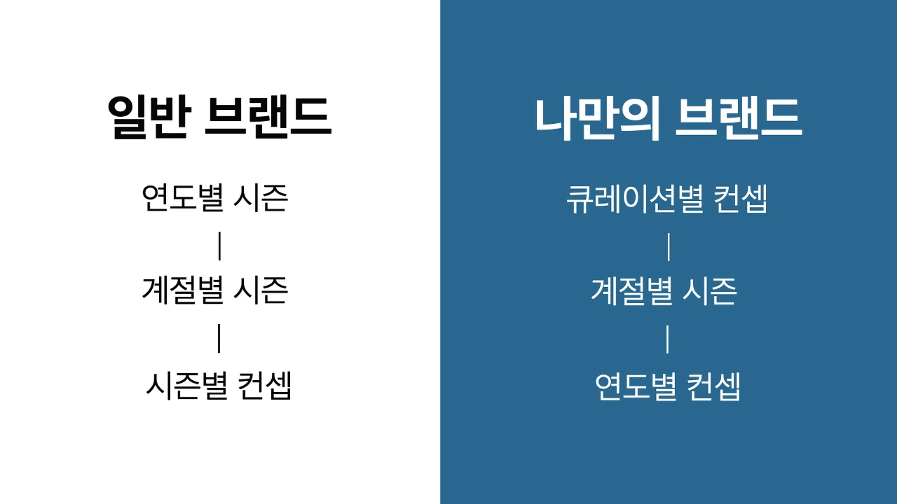 일반적인 디자이너 브랜드는 연도별 시즌, 계절별 시즌, 시즌별 컨셉으로 진행되는 프로세스에 맞춰 소비자들에게 제품을 판매했다면, 나의 '큐레이터 브랜드'는 그 방식을 정반대로 대입해 하나의 큐레이션으로 완성될 컨셉이 가장 상위에 존재하는 모델을 적용하는 것이 적합해 보였죠.