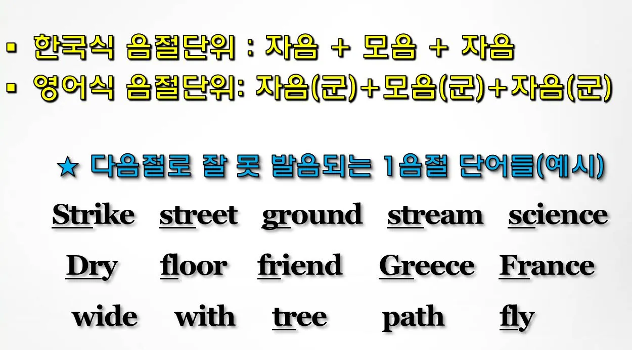한국어는 소리글자라고 하죠. 한국어는 글자가 발음기호입니다. 반면, 영어는 발음기호가 별도로 있습니다. 글자가 아니라 발음기호를 기반으로 발성이 된다는 뜻입니다. 한국어는 자음과 모음이 하나씩 결합되어 음절을 이루는데, 영어는 모음을 중심으로 앞뒤에 있는 여러 개의 자음과 결합해 하나의 음절을 만듭니다. ‘Best Friend’ 를 한국어로 발성하면 ‘베스트 프렌드’와 같이 6개의 음절로 발음이 됩니다. 자음이 여러 개 붙어 있으니 영어에 없는 모음 ‘으’ 를 억지로 넣어 ‘자음+모음’ 의 음절을 새로 만듭니다. 반면, 영어에서는 [Best Frend] ‘베슷 프렌 ’ 과 같이 2음절로 발음됩니다. 쉽게 말하면, 영어는 모음중심으로 발성을 하는 것입니다. 영어에서 자음은 별로 중요하지 않습니다. 자음이 여러 개 이더라도 한 개처럼 취급합니다.