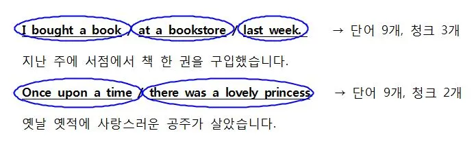Once upon a time / there was a lovely princess. → 9개 단어, 2개의 청크