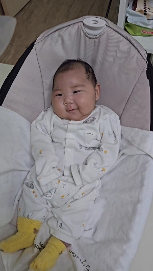 그 뒤로도 재재는 때때로 웃음인지 찡그림인지 헷갈리긴 해도 웃음기에 가까운 표정을 몇 번 보여주었다. 이제 나는 감사하고도 오만한 태도로 재재의 진짜 확실한 웃음을 손꼽아 기다리게 되었다. 그리고 그즈음 어느 날, 아침에 바운서를 타던 재재가, 웃었다고 했다. 나는 밤에 재재와 씨름하고 나서 쓰러져 자느라 못 봤다. 대신 사진을 봤다. 분명히 씨익, 환한 웃음은 아니지만 미소가 분명한 얼굴. 젠장 이렇게 확실한 첫 미소 직관을 자느라 놓치다니.