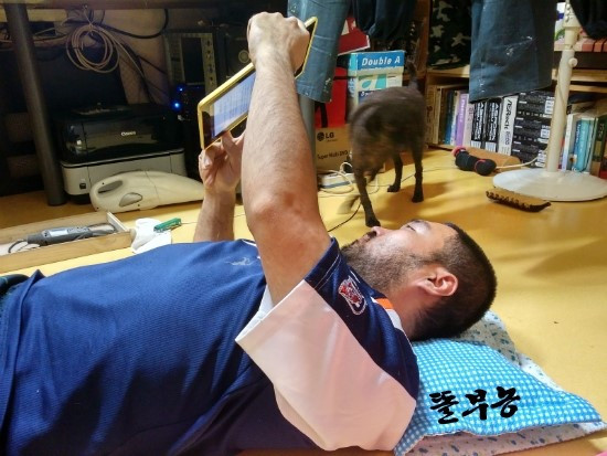 집에 있으면 등을 방바닥에서 떼질 않아요.