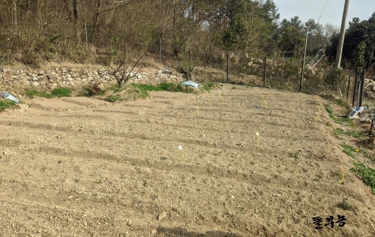 관리기로 갈아놓은 2단 밭은 풀이 없어 씨앗 뿌리기가 좋습니다.