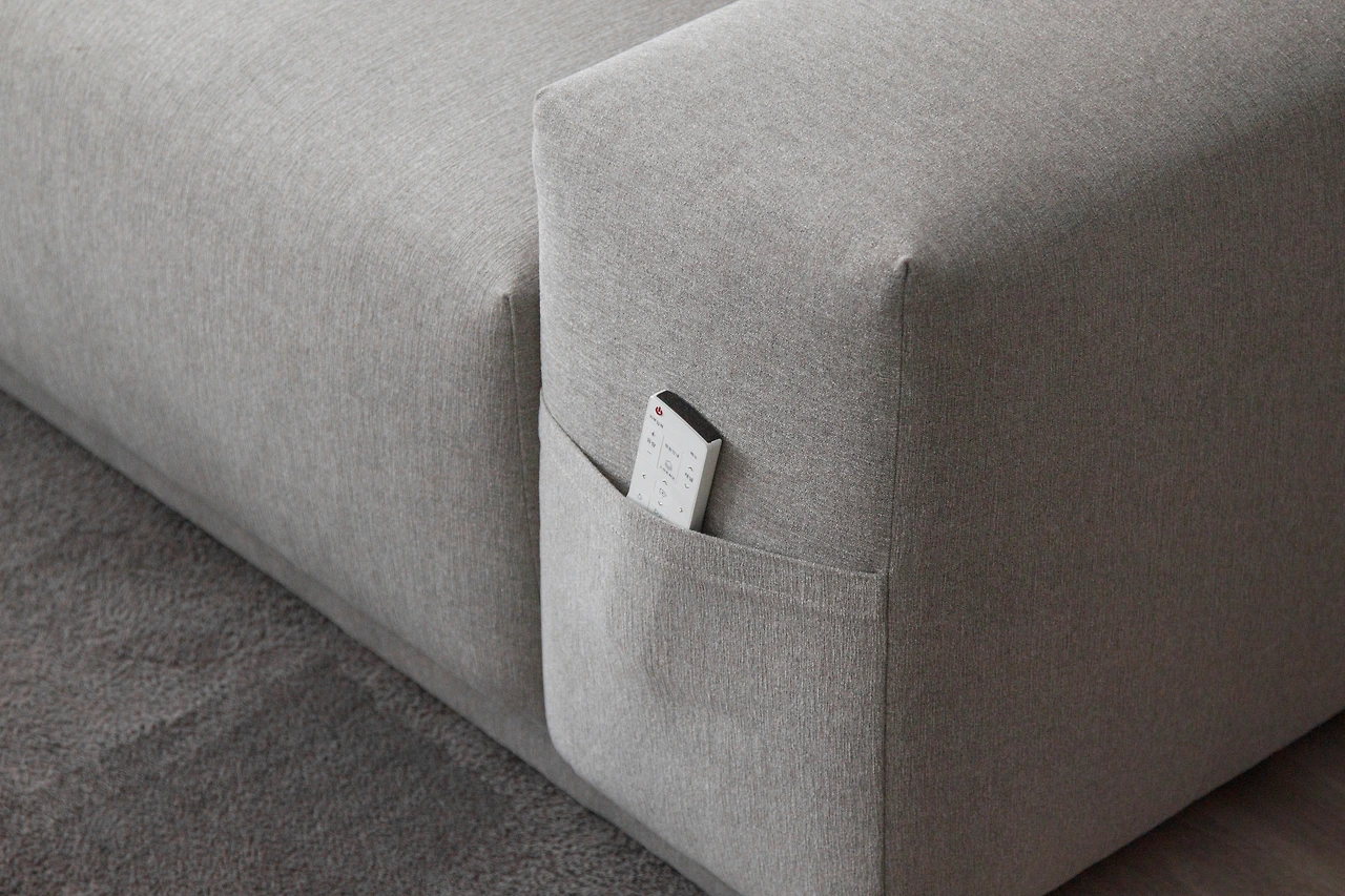 디테일은 여기서 끝나지 않습니다. 넓은 팔걸이 앞면에는 작은 '히든 포켓'을 숨겨두었습니다. 툭하면 사라져서 온 가족이 소파 틈새를 뒤지게 만드는 주범, 리모컨을 위한 전용 주차장입니다. "멋진 디자인에 주머니가 웬 말인가" 싶을 수도 있지만, 생활 속의 작은 불편함을 해결해 주는 것 또한 가구가 지켜야 할 기본이니까요.