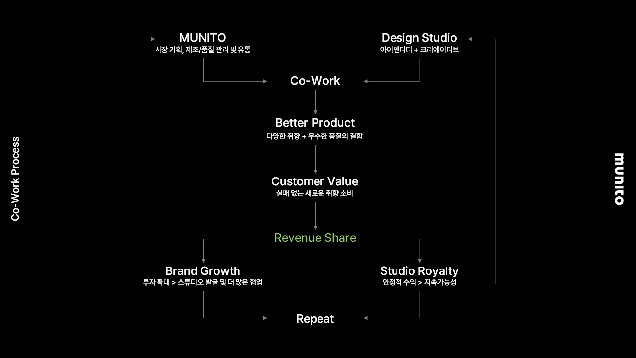실력 있는 디자인 스튜디오들이 무니토와 협업하여 매출을 만들고, 그 정당한 대가(Royalty)로 스튜디오 운영의 안정을 찾습니다. 스튜디오가 불규칙한 클라이언트 잡에만 의존하지 않고 자생력을 갖추게 되면, 한국 가구 시장에는 더 실험적이고 멋진 디자인이 쏟아져 나올 것입니다.