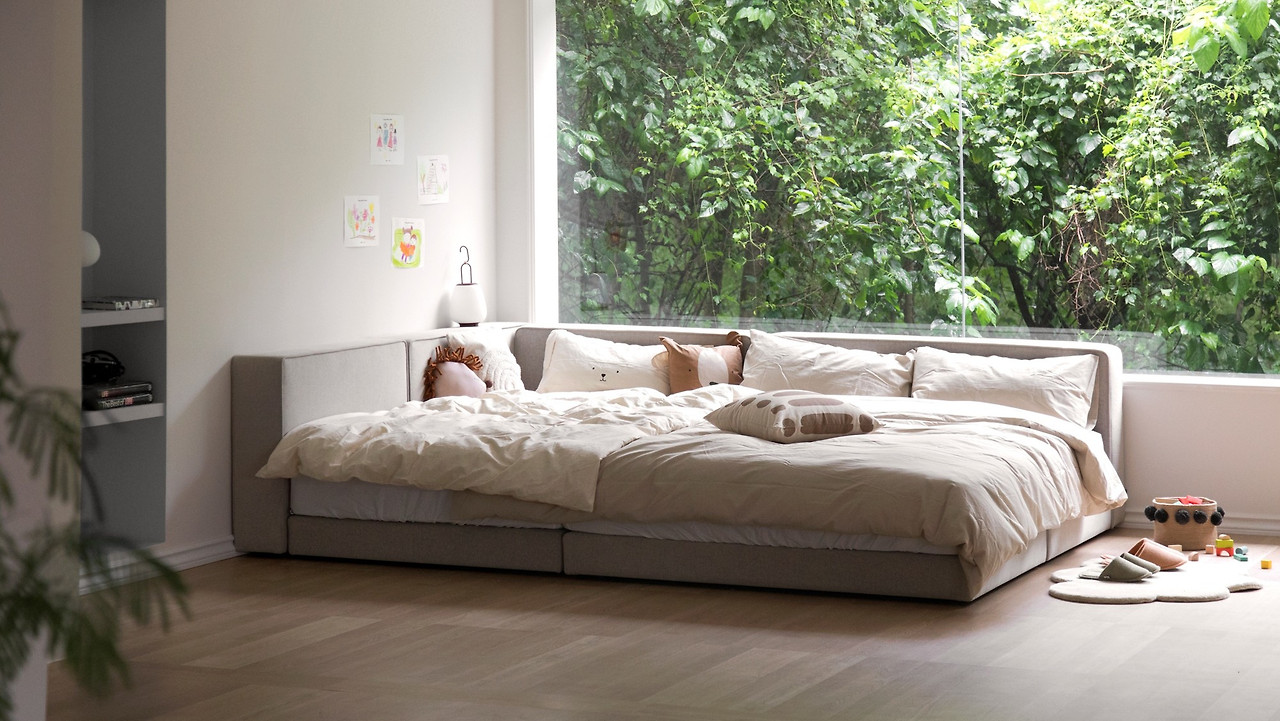 Timeless Family Bed: '가족'이라는 카테고리를 가장 상징적으로 보여주는 침대입니다. 모두가 함께 뒹굴며 온기를 나누는 시간, 그것이 회복의 시작이라 믿었습니다.