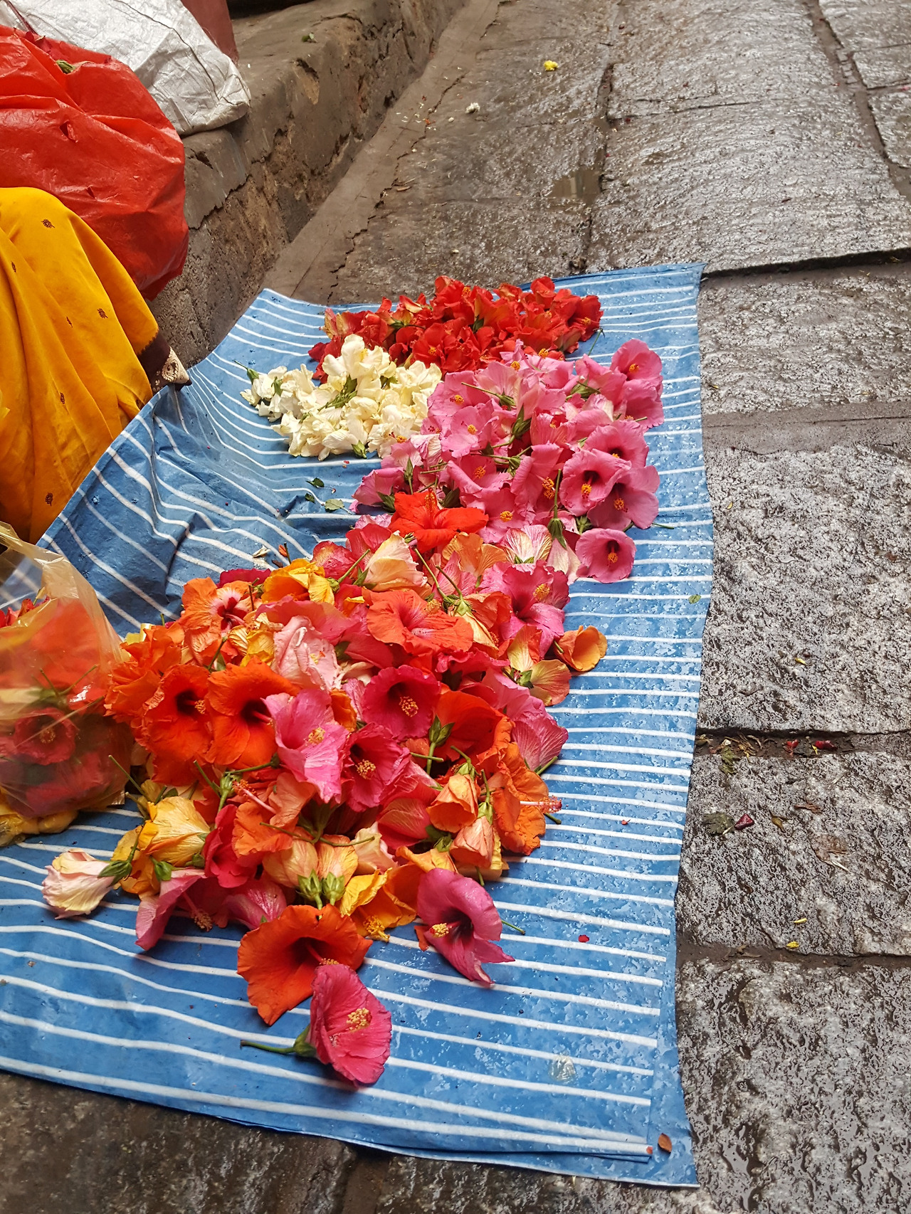 일요일 이른 아침이라 군데군데 문이 닫힌 가게들이 있었음에도 그 좁은 골목에 다다른 순간 나는 '밀려온다'는 표현이 맞을 정도로 눈이 부신 색깔과 향기에 압도되었다. 잎이나 줄기 없이 오로지 꽃만을 가득 담은 자루를 양손에 들고 사방에서 '쏘리'를 외치며 사람들 사이를 바쁘게 움직이는 배달부들과 꽃을 실로 꿰거나 엮고 있는 상인들의 분주함마저 아득하게 덮어버릴 정도로 찬란한 색깔들이었다.