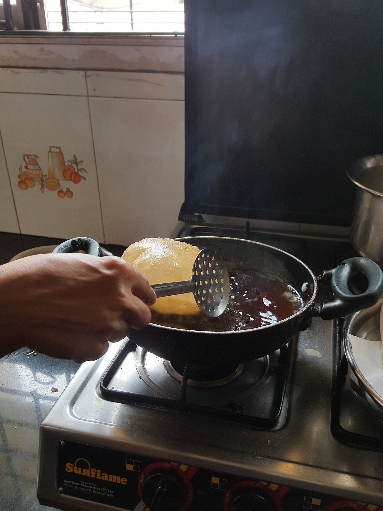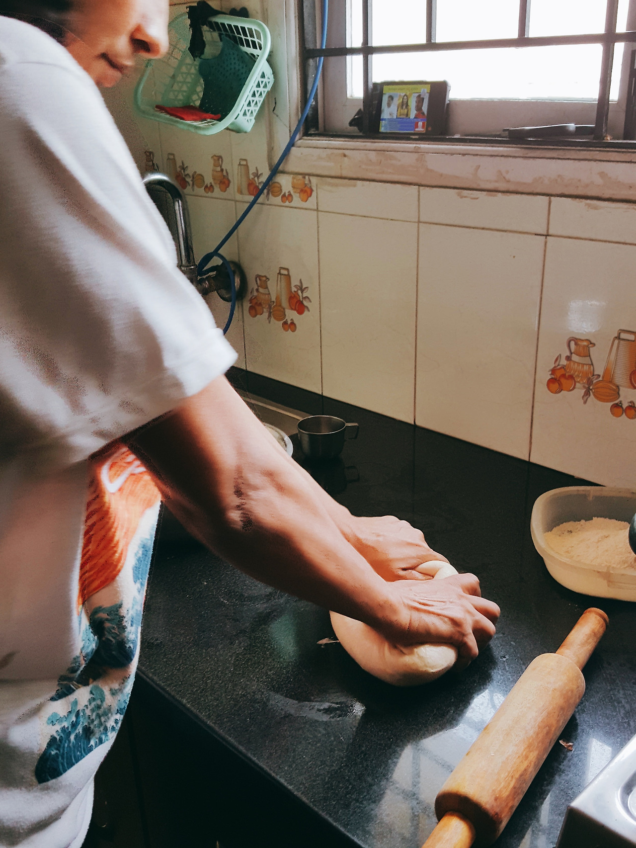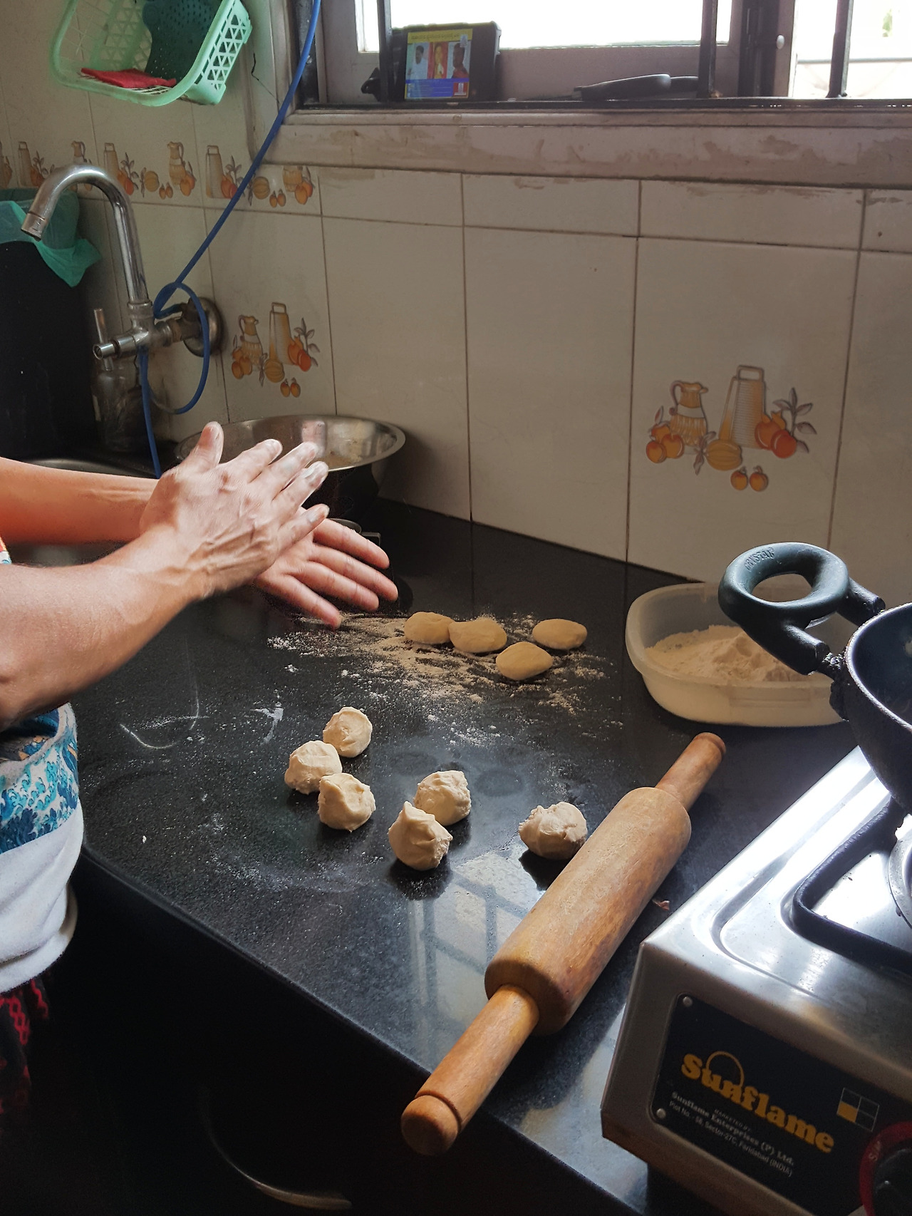 밥이 아닌 차파티나 뿌리를 점심으로 먹는 날이면 디디께서는 아침을 먹자마자 반죽을 준비하신다. 숙성이 된 반죽은 우리가 점심을 먹기 위해 도착해서야 차파티 혹은 뿌리로 탄생하는데 디디께서는 내가 이 과정을 볼 수 있도록 밀가루 묻은 손 대신 고개로 까딱까딱 부엌을 가리키시며 '경진, 컴! 컴!'하고 나를 꼭 부르신다.
