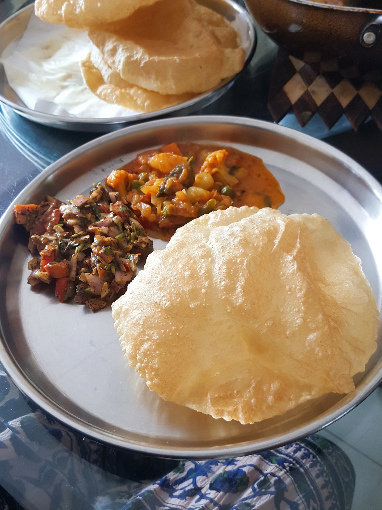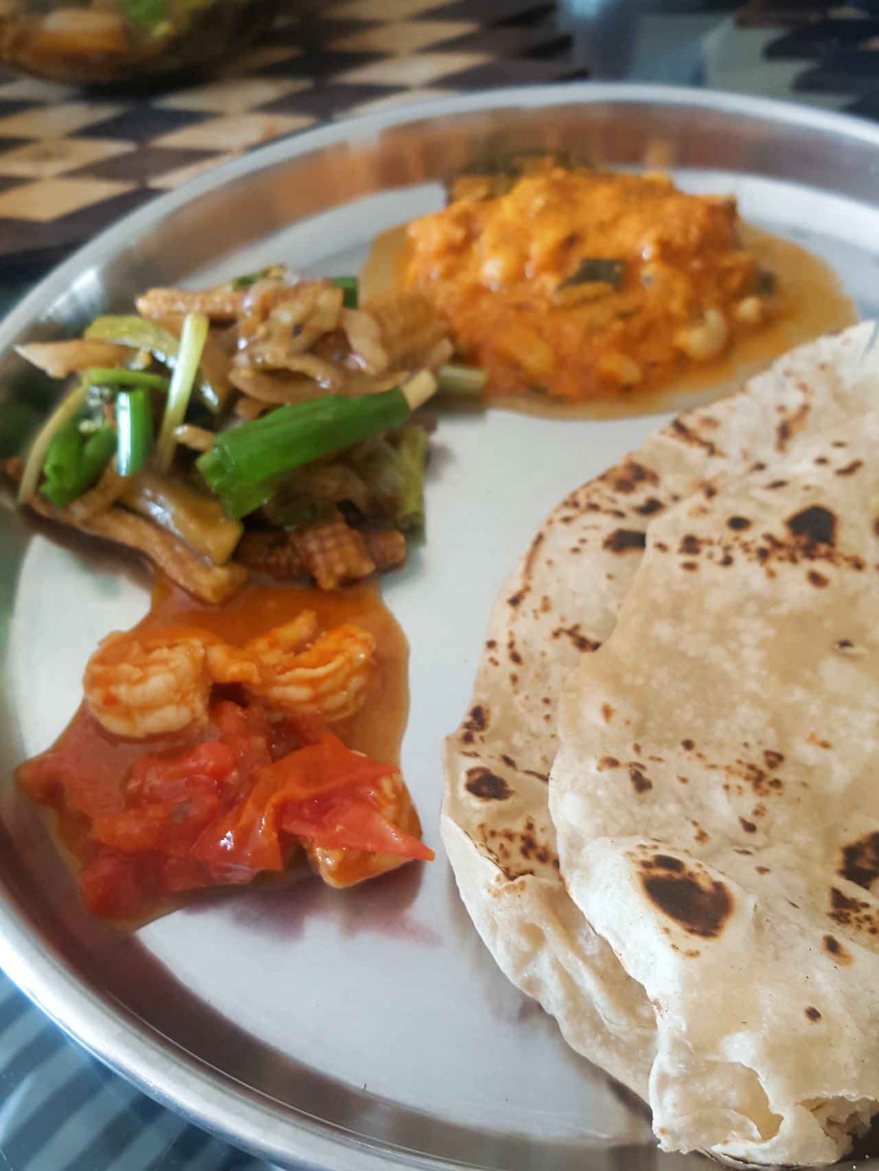 음식의 종류가 많을 뿐만 아니라 점심은 아침보다 식사시간이 길기 때문에 식탁 위에서는 더 다양한 주제의 대화가 오가며, 특히 음식 자체에 대한 많은 이야기를 들을 수 있다. 무엇보다도 집에서 직접 로티(Roti), 차파티(Chapati)와 뿌리(Puri)를 만드는 과정을 볼 수 있다는 것은 대단한 경험이었다. (차파티는 로티의 일종이다. 보통 조금 더 얇게 만든 것을 차파티라고 부른다고 한다.)