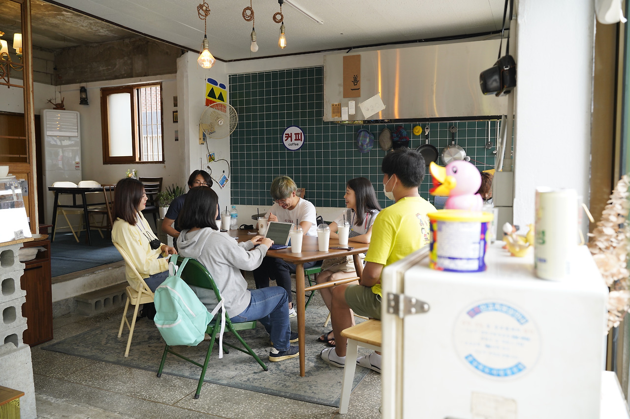 청량하고 높은 가을 하늘이 돋보이는 아침. 저는 문경읍 내에 있는 핫플레이스 카페 선일로 향했습니다. 처음 만나서 이야기 나눠볼 분들은 버스킹 대원들이에요. 가장 먼저 도착한 댕댕님, 뒤이어 충돌님과 버스킹 대원들의 담당 지기 부엉님이 도착했습니다. 약속시간인 10시까지 늦잠을 주무신 누들님도, 카페 선일 사장님이 수제로 내려주시는 커피를 기다리다 보니 어느새 번개 같은 속도로 이곳 테이블에 자리를 잡고 앉으셨네요.