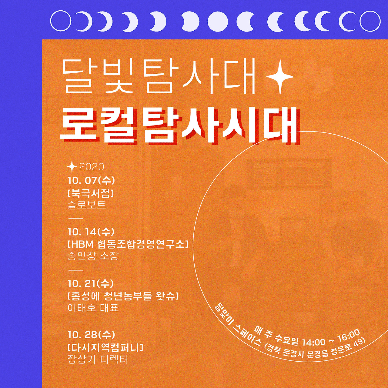 인천 부평구의 독립서점 <북극서점> 대표 슬로보트님의 강연을 시작으로 10월 로컬탐사가 이어집니다. 앞으로의 일정은 아래 이미지를 참고해주세요.