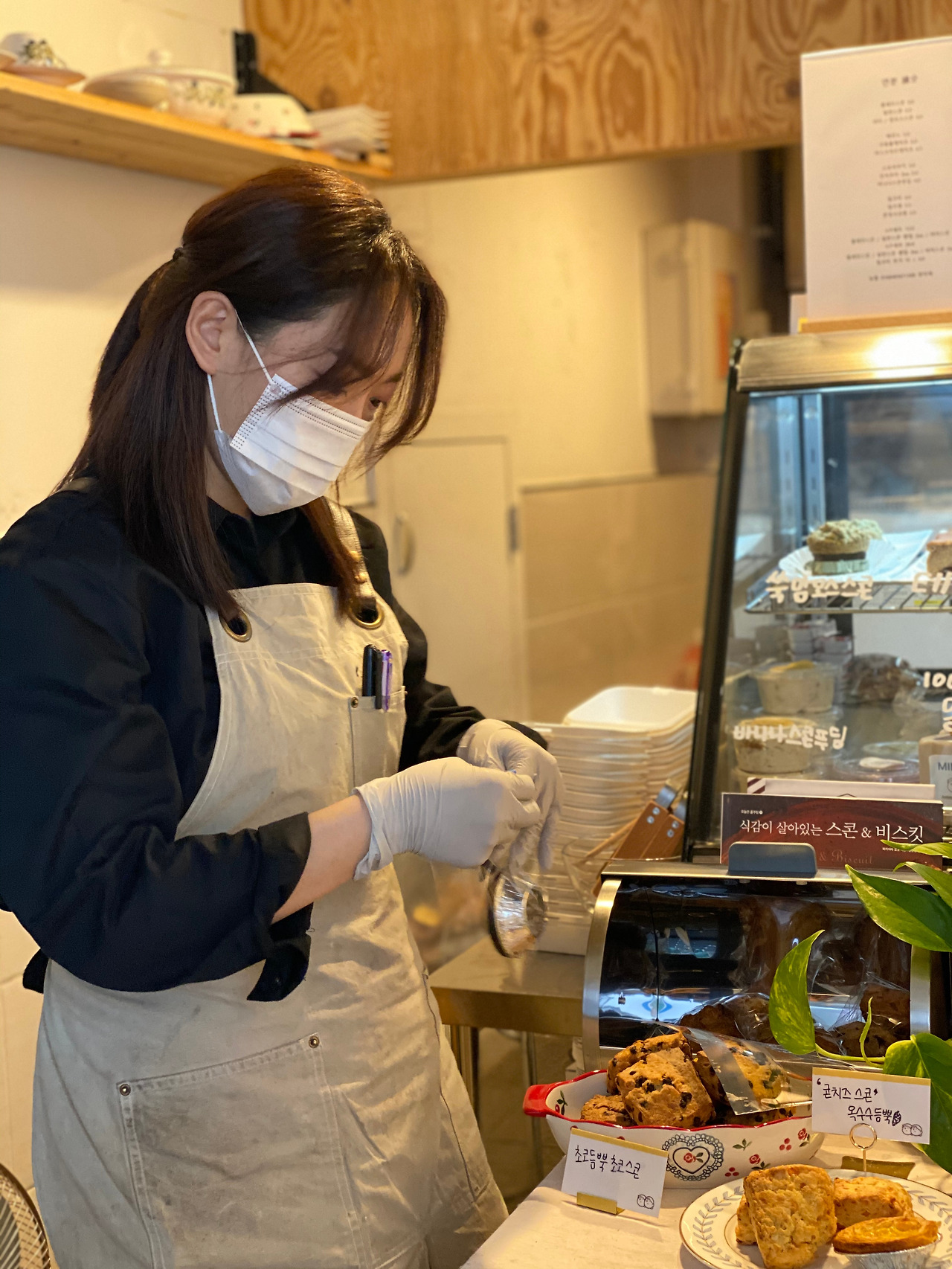 연 : 구움 과자의 대표 격인 것이 스콘과 쿠키이긴 한데. 이곳 점촌에 스콘 전문점이 없어서 선택을 하게 됐어요. 지금은 스콘이 트렌드이기도 하고요. 문경 사과를 조려서 만든 크럼블을 올린 '애플 크럼블 스콘'이 대표 메뉴예요. 앞으로 시즌별 제철과일을 이용하면서도 찾아주시는 분들이 계속해서 새로움을 느끼실 수 있도록 메뉴가 겹치지 않도록 신경 쓰고 싶어요.