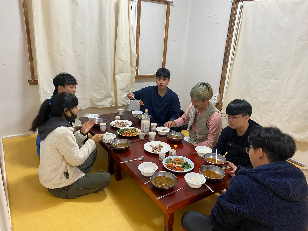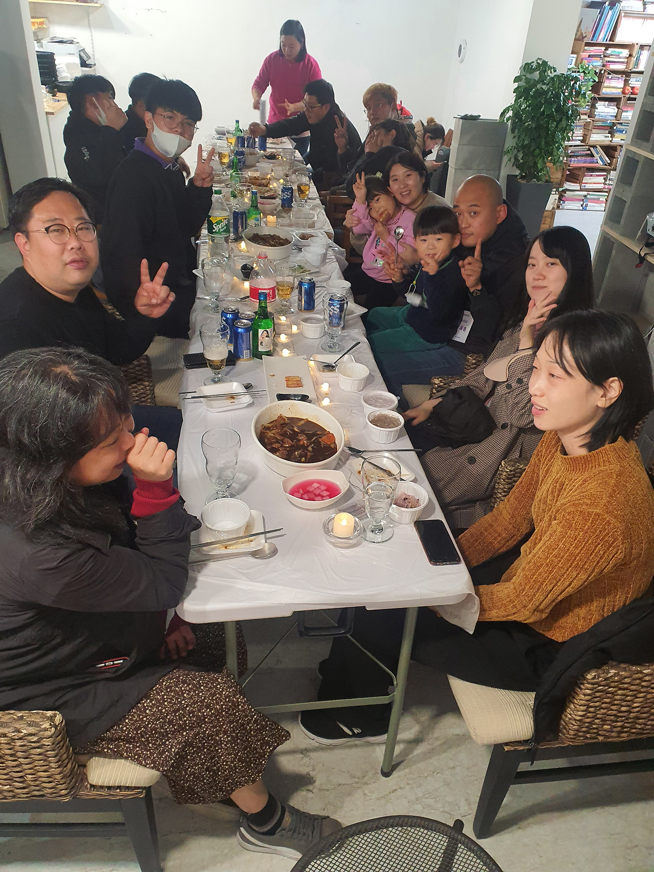 낮 : 11월 2일 랜딩데이에 도착했기 때문에 문경에 대해 아직 많은 것을 알진 못해요. 걸어서 어딜 가든 산자락이 보이고, 공기가 맑아서 비염이 치료되겠구나 (웃음). 앞으로는 무엇보다 알아갈 사람들이 기대돼요. 며칠간 사람들을 만나다 보니 눈에 띄는 친구가 하나, 근처 중학교에 다니는 학생인데 행사 참여율이 거의 <달빛탐사대> 객원멤버나 다름이 없더라고요. 같이 별 보러 야간 새재 트래킹에 갔는데 청년들이 모여서 진행하는 프로젝트에 지역 청소년이 관심을 가져주니 신기했어요. 새로 생긴 이웃 같았죠. 함께 살게 된 달빛 숙소 1호 분들도 잘 챙겨주시고, 북바인딩 클래스 홍보를 위해 달려와준 현수 씨에게도 감사했어요.