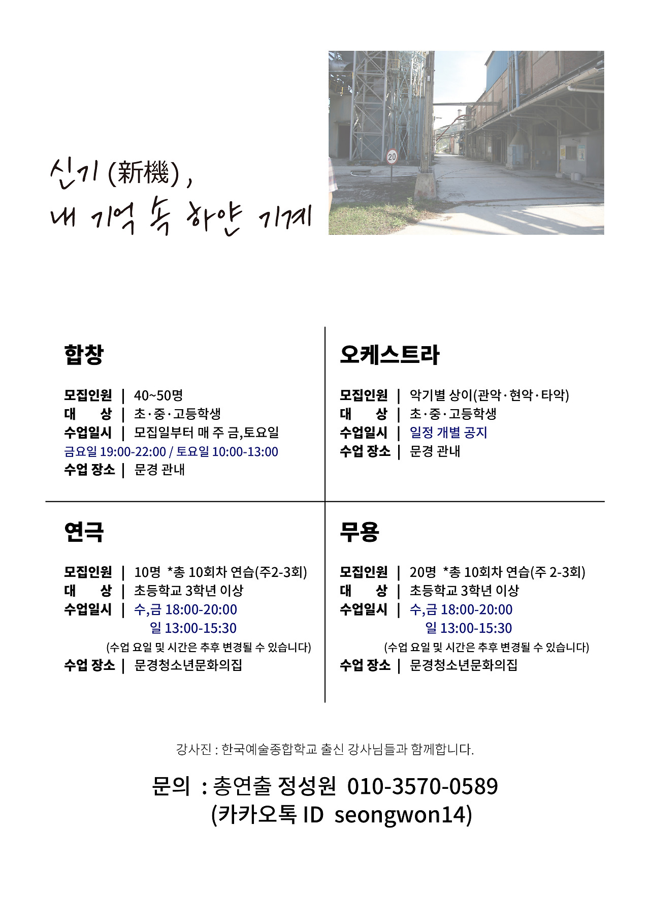 정성원 대원님의 공연기획 프로젝트 "신기, 내 기억 속 하얀 기계"의 청소년 CREW를 모집하는 트레일러가 공개되었습니다. 공연자분들과 유현수 대원, 임보라 대원, 탐사대장님까지 함께 해 만든 이번 트레일러. 신기의 옛 공장에서 어떤 공연이 펼쳐지게 될까요? 이 브런치를 쓰고 있는 동안에도 아이들이 공연을 위해 합창/무용/연기/기악 연습을 열심히 하고 있을 텐데요. 멋진 선생님들과 함께 공연하고 싶은 문경 청소년 여러분들이 있다면 다음 주에도 언제든 아래 전화번호로 연락 주세요!