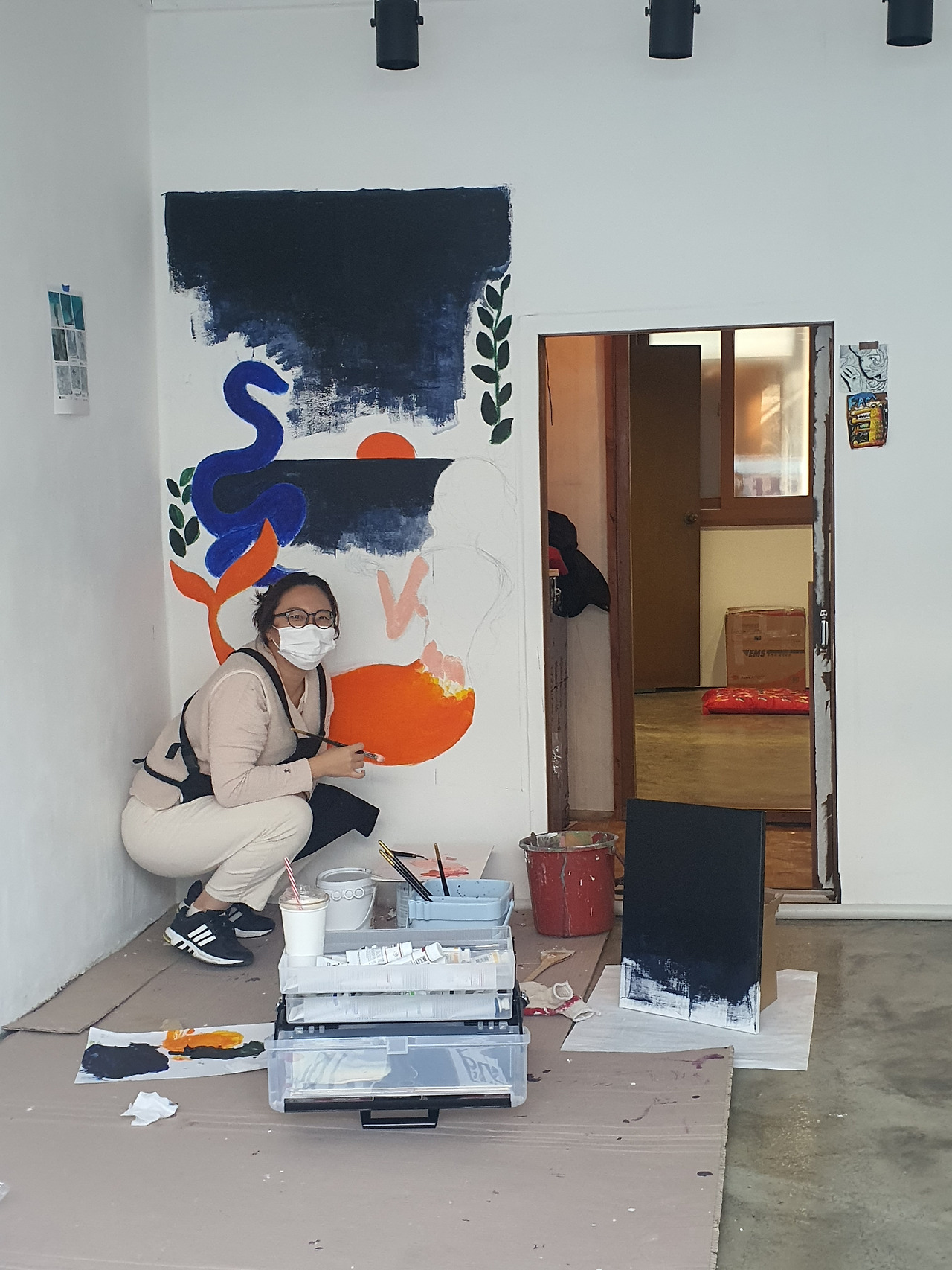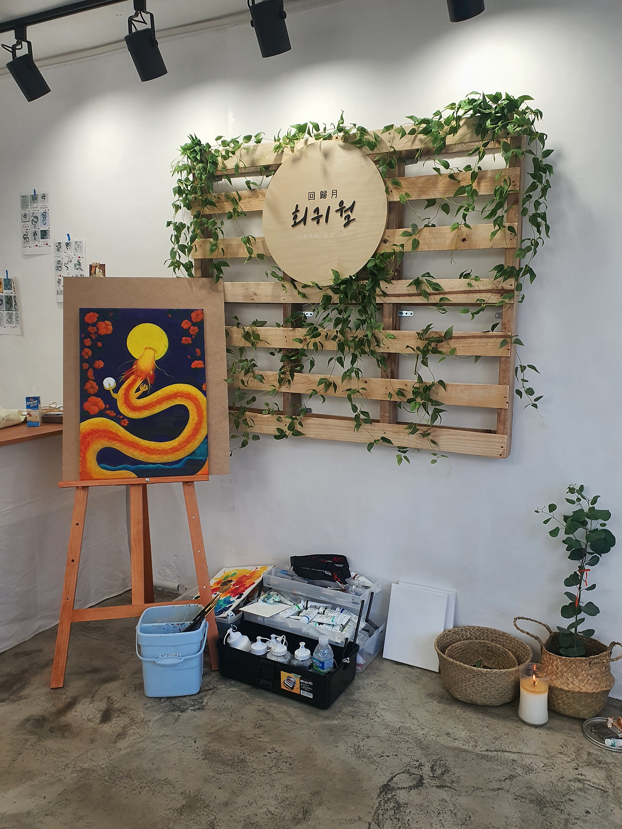 연 : 붓을 다시 잡으며 "나로 돌아간다"라고 느끼는 것 같아요. 달이 궤도를 돌며 온연한 제 모습을 되찾는 것처럼요. 그래서 이 곳 <회귀월>이 내 삶을 재창조하는 공간이 되길 바라요. 저는 아크릴 물감을 주로 쓰는데, 아크릴의 특징은 덮어서 다시 그릴 수 있다는 거예요. 과거의 힘들었던 것들을 지울 수 있다면 지워보고, 재창조할 수 있는 그런 계기가 되면 좋겠어요.