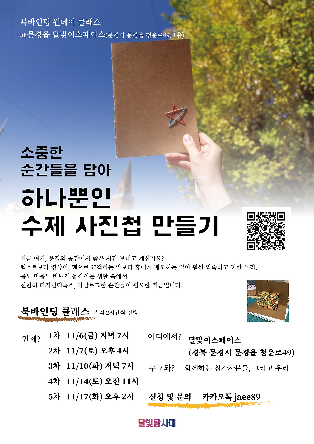 11월 6일 저녁, 낮달님의 첫 번째 북바인딩 원데이 클래스가 달맞이 스페이스에서 열렸습니다. 총 다섯 번의 원데이 클래스를 기획하고 있는데 두 번은 탐사대원을 대상으로, 나머지 3번은 문경 시민과 관광객을 모집해 진행할 예정입니다.