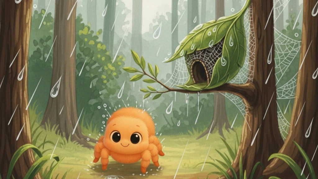 귀여운 아기 거미 플링도 비를 피해서 거미줄과 나뭇잎으로 만든 자기 집으로 쪼르르 들어갔답니다.