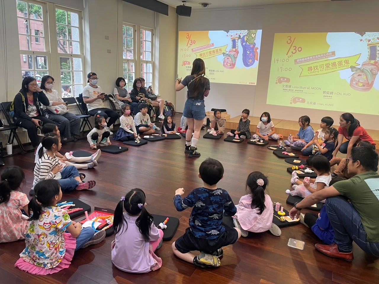 큰 창문들 앞에는 접이식 의자들을 한 줄로 쭉 나열해 두었는데, 참여자들의 부모님들이 앉아서 수업을 참관할 수 있는 지정석을 구성해 두었다는 점이 인상적이어서 Monica 선생님께 질문을 했더니 대만의 워크숍에서 영유아가 참여하는 경우 신청할 때부터 부모 중 한 명 이상은 수업이 시작하고 끝날 때까지의 모든 시간에는 배석하여 아이들의 활동을 참관하거나 혹은 책을 읽거나 핸드폰 확인을 하는 등 개인의 시간을 보내는 것이 일반적이며 아이들만 참여하는 워크숍은 수업을 준비한 예술 강사가 특별히 요청한 경우가 아니라면 아이들을 보육원에 맡기듯 공간에 둔 채로, 수업 환경을 벗어나는 일은 없다는 답변을 해 주셨다. 워크숍에 아이들을 참여시켜 두고선 삼삼오오 모여서 자리를 떠나는 한국의 학부모님들을 자주 봐왔기에, 이 이야기는 무척 흥미로웠다. 물론, 예술교육의 의미가 이제는 기술예술교육에서 창의예술의 경험으로 바뀌고 있기에 한 공간에서 학부모님과 아이가 동반하여 수업을 진행하나, 학부모님들의 적극적인 참여를 독려하고 함께 만들어내는 예술교육프로그램이 아닌 수동적으로 아이들의 뒤에서 그저 참관하는 형태로서는 창조적인 상상력을 발휘해야 하는 예술 체험에서 아이들에게 과연 옳은 것일까라는 질문은 여전히 내 마음속에 남아있다. 하지만, 학부모님들이 아이들이 참여하는 예술교육프로그램이 이루어지는 공간에 함께 함으로써 어떤 이야기들이 오고 갔으며, 활동들을 통해 아이들이 어떤 창의적인 활동을 하고 있는지를 학부모도 함께 발견할 수 있다는 것 외에도 여러 장점들은 분명 존재한다고 생각한다.
