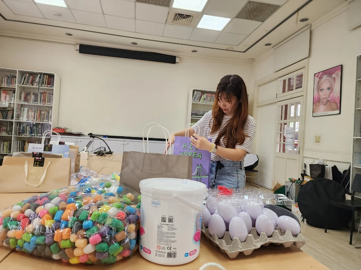 대만 MoCA에 도착해서 비닐팩에 담긴 엉뚱한 재료 패키지를 각각의 쇼핑백에 담고 보이지 않게 한번 접어낸 후 숫자가 쓰인 텍을 스테이플러로 고정시켰다. 아이들은 웜업이 끝나고 아이템 제작을 시작할 때 계란판 위, 알 모양의 플라스틱 통을 랜덤으로 하나씩 고르고 그 알에 쓰인 숫자와 같은 쇼핑백을 찾아가는 것으로 개인 재료를 나눠냈는데 처음에 제안했던 아이디어는 이 쇼핑백을 미술관 공간 속에 숨겨서 보물을 찾듯, 자신의 알의 숫자와 같은 쇼핑백을 찾아가며 그 흥미를 높이는 것이었지만 공간의 제약상 이 과정은 생략되었다.