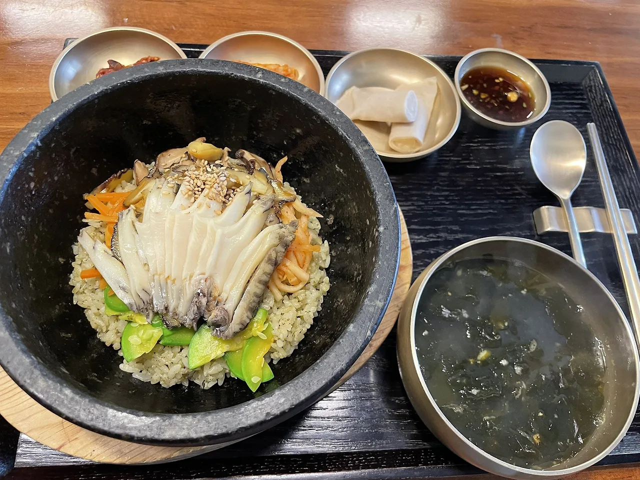 전복소라돌솥비빔밥 완전 맛있었음! 간이 세지 않은 간장 소스에 슴슴하고 건강한 맛. 신선한 해물 재료로 제주도에서만 맛볼 수 있는 느낌이라 좋았다. 반찬에 뿔소라젓갈도 맛있고 빙떡인가 제주도 음식도 있어서 신기했다.정말 별 다섯개 주고 싶었던 신선한 재료와 세지 않은 양념으로 건강해지는 기분이 드는 맛집이었다!2022.03