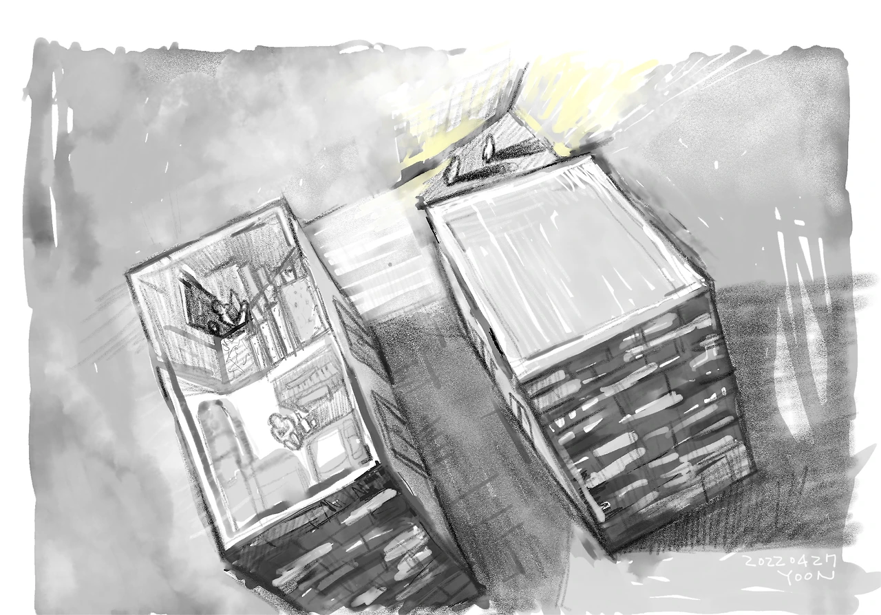 빌라 옆 동에 좁은 틈새로 들어가면 삼각형 모양의 작은 시멘트 바닥이 있었다. 나는 동생을 데리고 그 공간에 자주 갔다. 열쇠를 두고 온 날 집에 아무도 없을 때면 가족 중 누군가 올 때까지 잠긴 문 앞에서 기다렸다. 현관문 앞 계단에 앉아 책을 읽다가 그래도 지치면 혼자라도 그 삼각형 공간에 갔다. 언젠가부터 나는 그 곳을 아지트라고 불렀다. 사람 한 세 명이 들어서면 꽉 찰 것 같은 공간에 하릴없이 왜 자꾸 갔을까. 좁아진 집 안에서 더이상 어디로 숨어들 수 없었기에, 나는 어디론가 도망치고 싶었는지도 모른다. 내가 그림을 그리고 책을 읽고 일기를 쓰며 현실의 나는 잊고 이야기 속 세계로 빠져들 듯이. 도피하듯이. 현실의 내가 숨고 싶을 때 그 곳에 갔는지도 모르겠다.