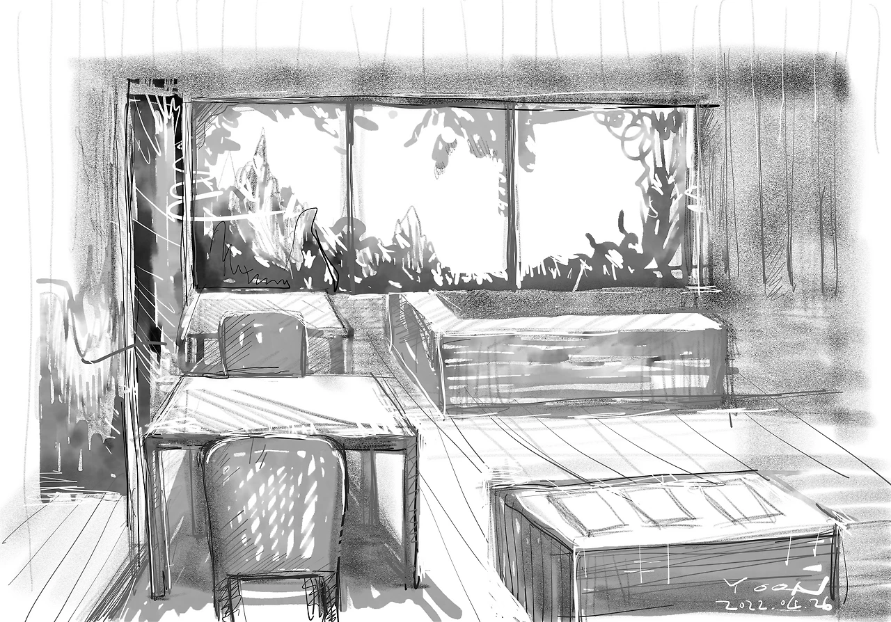 오랜만에 아이패드로 그림을 그려봤다. 새삼 깨닫는 사실, 그림 그리는 것도 여유로워야 가능하다. 일고여덟살 남짓이던 어릴 적 하루종일 그림 그리던 때를 회상하면 오후의 따사로운 햇살이 내 머리를 비추고 있다. 카페 창으로 쏟아지는 햇살을 받으며 그려본다. 종이에 직접 그릴 때처럼 손날에 볼펜이나 연필 때가 묻지 않아서 좋다. 디지털로 그리는 방식은 참 편리하지만 내가 아직 툴에 익숙치 않아서 한편 조금 낯설다. 무얼 그릴 지 몰라 카페의 풍경을 그리기 시작하다가, 자꾸만 사방으로 지나다니는 손님들을 괜히 의식하게 되길래 결국 마음대로 그렸다.