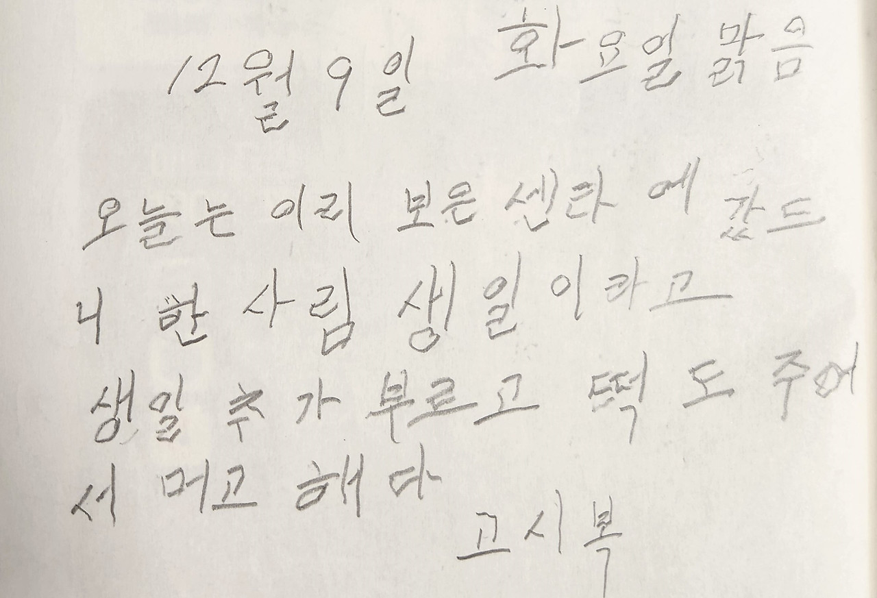'오늘은 이리 보은센터에 갔더니 한 사람이 생일이라고 생일축하를 부르고 떡도 줘 먹었다.'