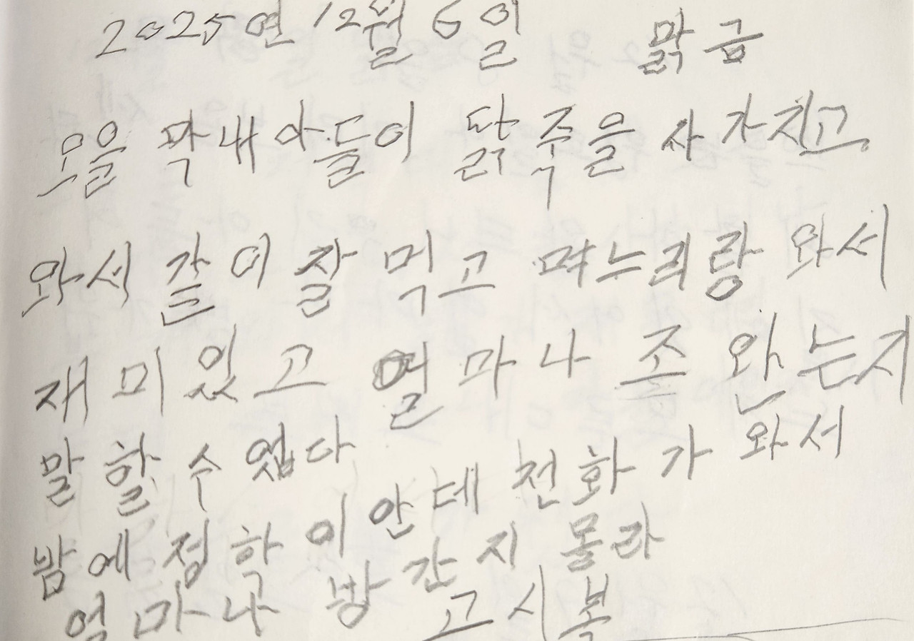 연필을 잡아 본 것이 참 오래였다. 손에 힘이 없어 연필이 자꾸 미끄러졌고, 국문이 잘 떠오르지 않아 글자도 자꾸 망설여졌다. 무슨 이야기를 써야 할지 한참을 생각하다가 몇 줄 적고 나니 금세 지쳤다. 며느리는 생각나는 대로 쓰면 된다고 했다.