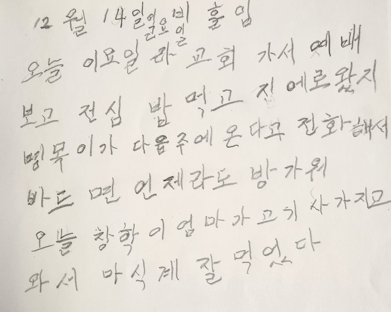 '오늘 일요일이라 교회에 가서 예배를 보고 점심밥을 먹고 집에로 왔다. 병목이가 다음 주에 온다고 전화를 해서 받으면 언제라도 반갑다. 창학이 엄마가 고기를 사가지고 와서 맛있게 잘 먹었다.'