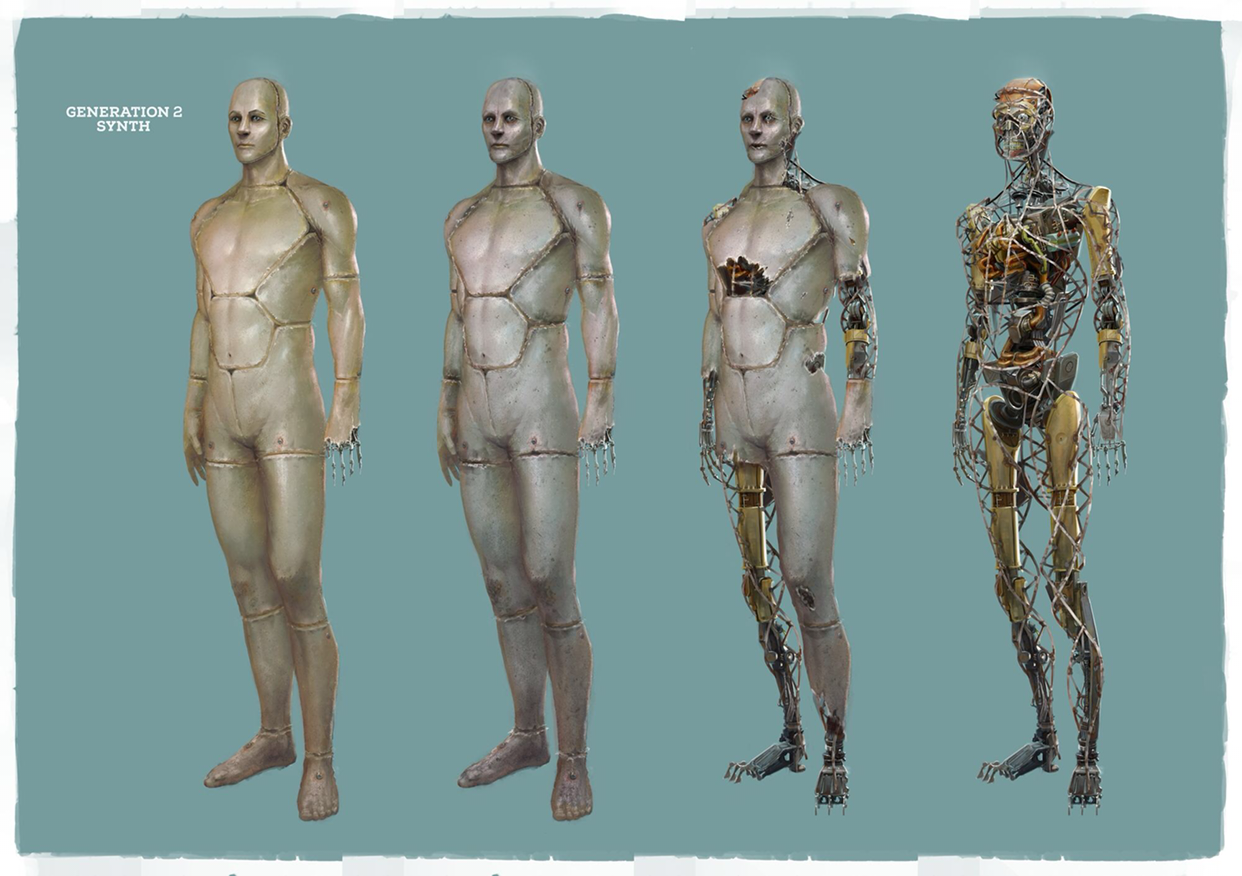 이는 게임 "폴아웃"에서도 신스(Synth)라는 인조인간으로 묘사됩니다. 인조물질, 합성한 등의 뜻을 지닌 영단어 'Synthetic'을 줄여서 인조인간들을 일컫는 명칭으로 사용됩니다. 흥미롭게도 위에서 시사한 바와 같이 자신의 신념, 가치관에 따라 그들의 운명을 주인공이 결정할 수 있습니다. 실제로 여러 세력이 나오는데, 핵전쟁 이후 지하에서 고도로 과학을 발전해 온 과학자 집단이자 이 신스들을 창조하고 인간의 하인, 내지 하위호환 등 노예로서 사용하려 한 인스티튜트(Institute), 그리고 그들은 인간과 다를 것이 없는 인간이므로 이들을 도와 탈출시키는 게릴라집단 레일로드(Rail road), 그리고 인간 이외의 존재들(방사능으로 인한 변종들, 피폭된 인간, 신스 등)을 부정물(Abomination)로 규정하여 이들을 지상에서 모두 제거하고 과거의 기술을 복구하여 인류 문명의 재건을 목표이자 이념으로 삼는 과거 핵전쟁 이전의 기술들을 발굴하여 나름 막강하고 거대한 군사조직에 가까운 세력인 강철 형제단(Brotherhood of steel)이 있습니다. 주인공이 어느 신념을 갖고 어떤 세력을 돕는지에 따라 운명이 바뀝니다.