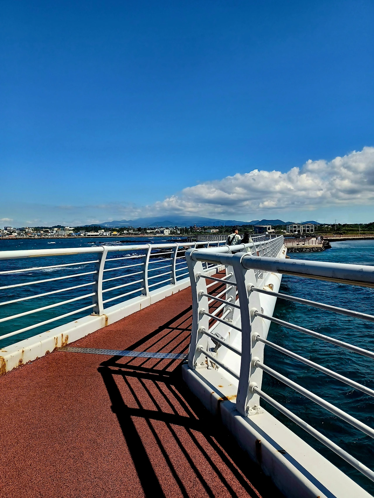 건물 옆으로 난 해안길로 빨려 들어가자 흉금 탁 트이게 시원스러운 전망과 더불어 새하얀 해상교가 길게 드러났다.
