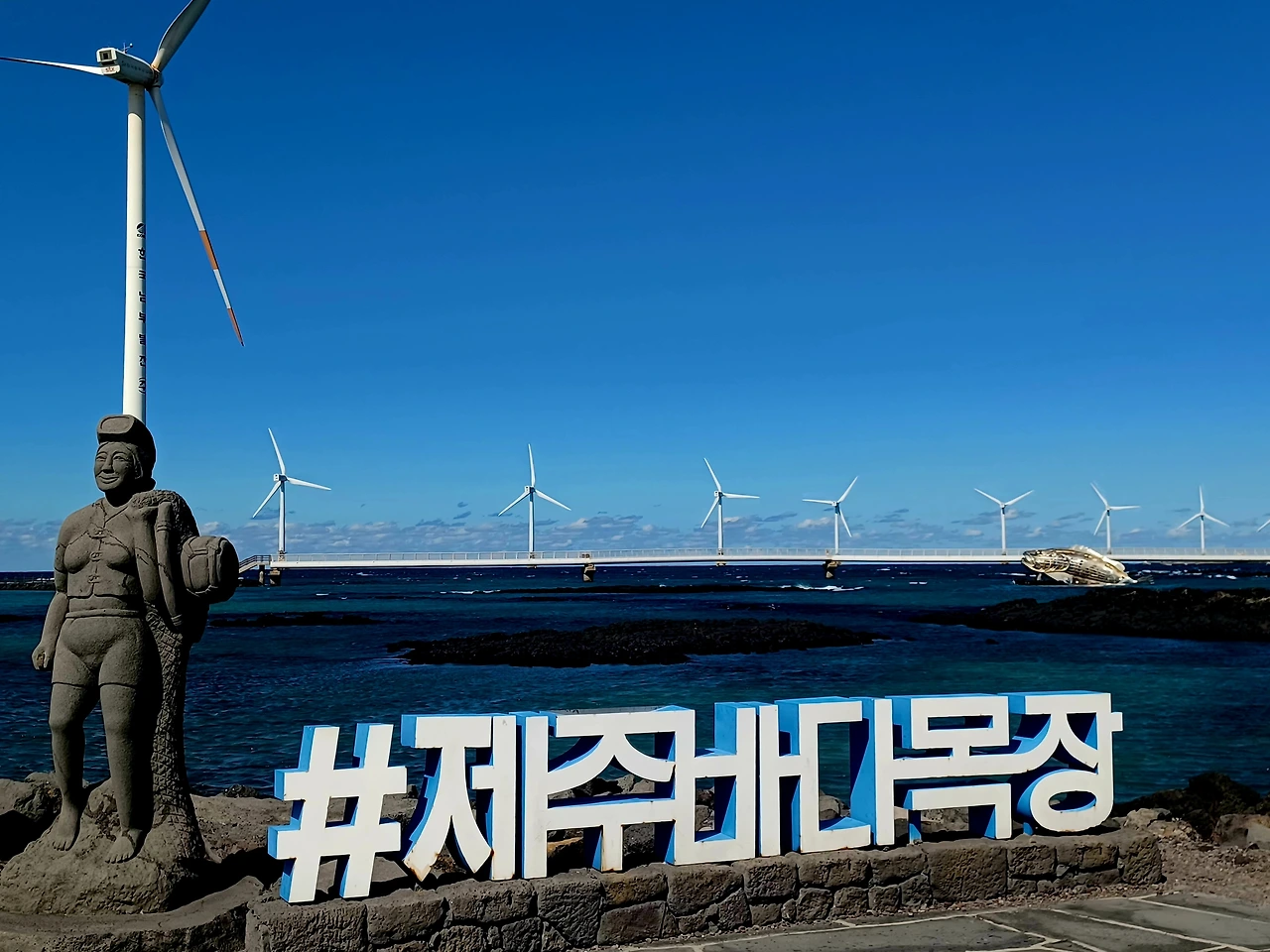 공원에서 바다 쪽으로 난 길을 따라 걸어 들어가자 해녀상과 제주바다목장이란 글자 뒤로 등대가 보였다.