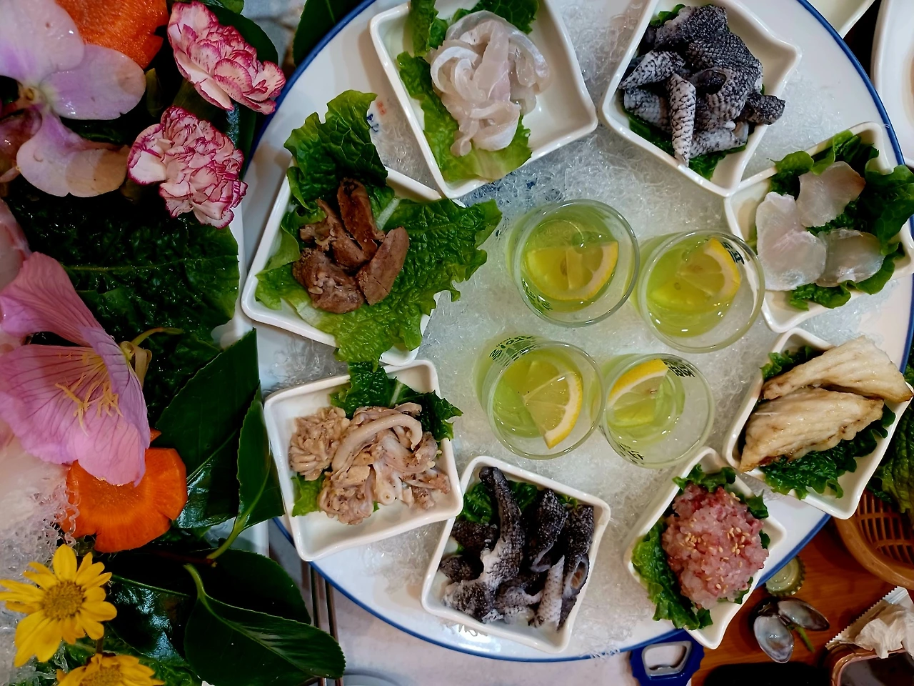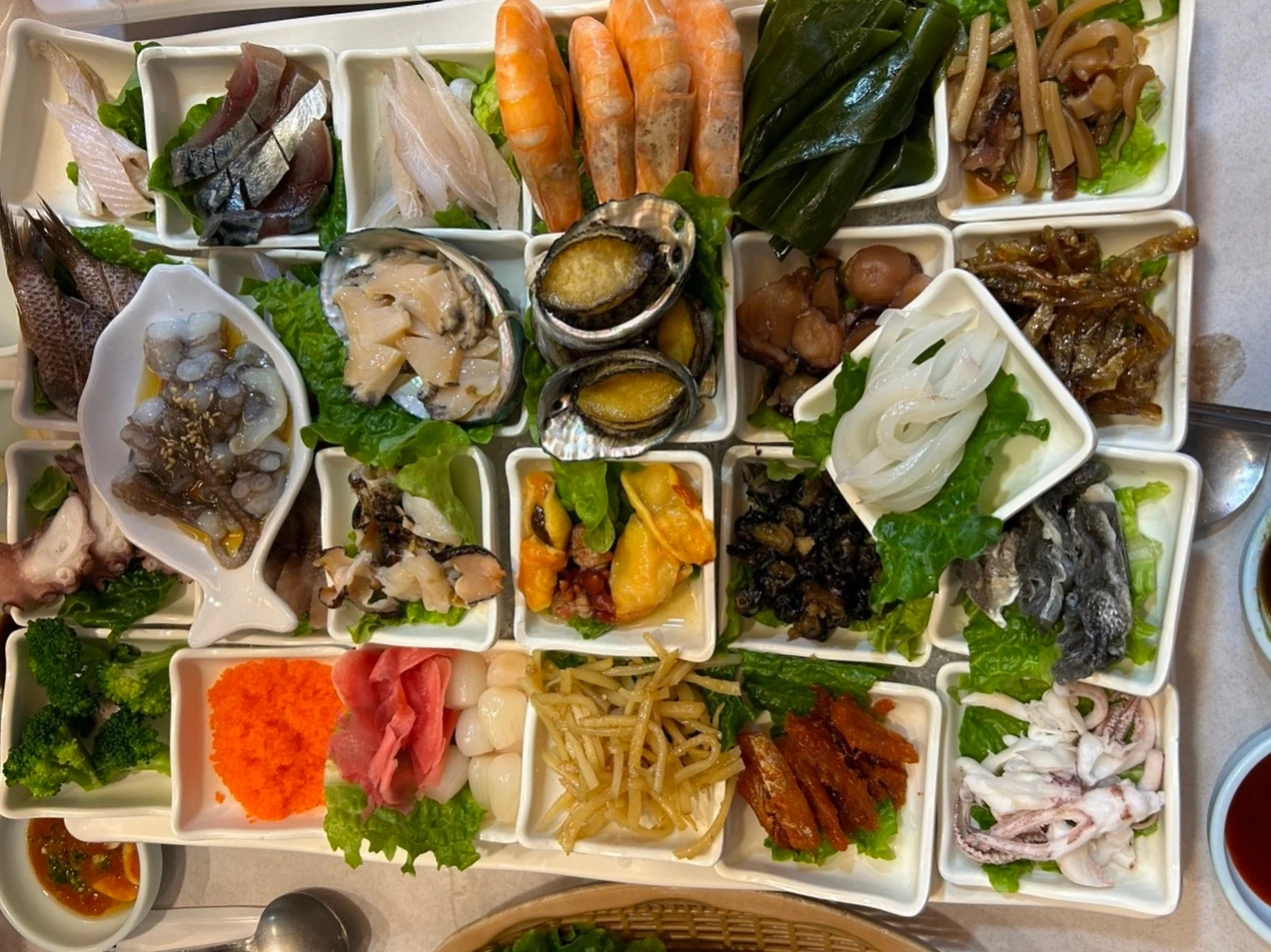 바삭하게 튀김옷을 입은 대하, 굵은 소금 치고 놋노릇하게 구운 자리돔, 전복패 안에서 움쭐거리는 전복, 꼬물대며 접시에서 탈출하려는 낙지, 껍질에 달라붙어 옹송거리는 굴, 비단결 같은 은빛 갈치회, 그 외 이름 모를 여러 생선회와 젓갈들.
