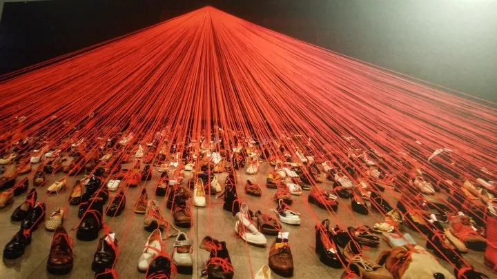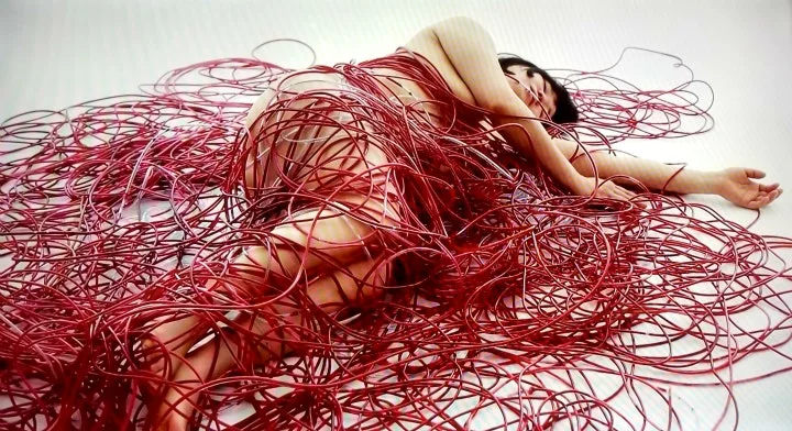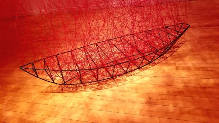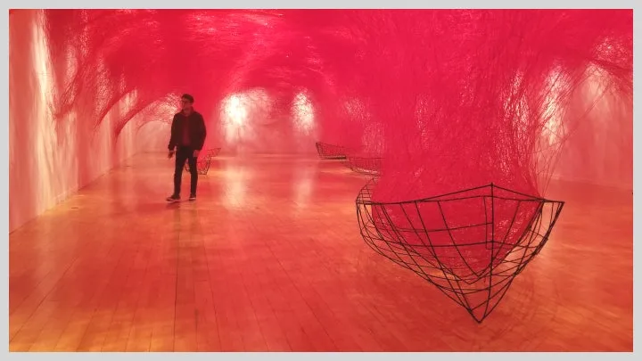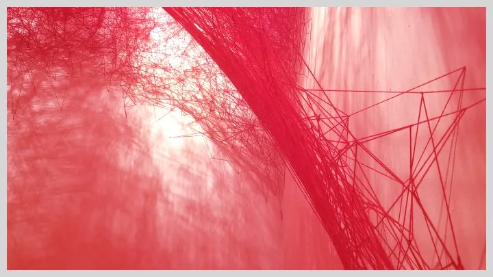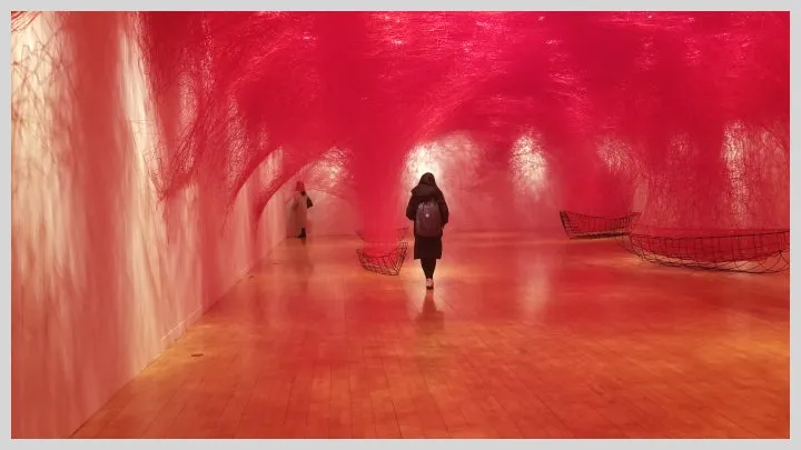 전시장에 들어서니 온통 붉다. 초입에서부터 그 빛에 압도당한다. 가히 충격적이다. 강펀치를 맞은 듯 순간 휘청, 아찔해진다. 심장 박동이 격해짐을 느낀다. 전시실 큰 공간 벽면과 천장 전체가 빨간색 실로 겹겹 엮인 채 수많은 연결고리로 이어져있다.