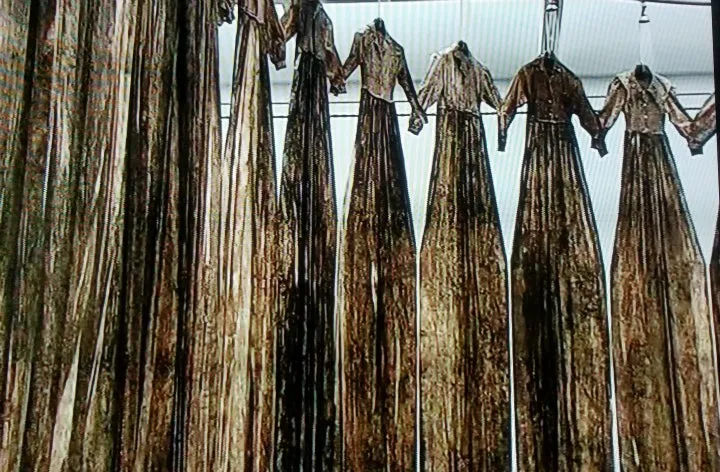 인간은 한 겹의 피부를 입고 태어나 제2의 피부로 옷을 입는다, 란 그녀의 멘트가 보인다. <피부의 기억>은 직접 바느질한 7미터 길이의 대형 드레스를 오물로 더럽힌 다음 벽에 걸어놓고 위에서 샤워기로 계속 씻어내고 있는 설치작업이다. 보기 좋은 그림만이 훌륭한 예술일 수 없듯 현대미술의 차원은 보기 좋은 게 전부는 아니었다.