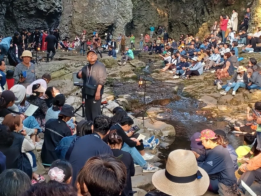 예술제는 안덕계곡의 아름다운 풍광과 물소리 이웃하여 천연 바위 위에서 어우러지는 특이한 공연이었다.