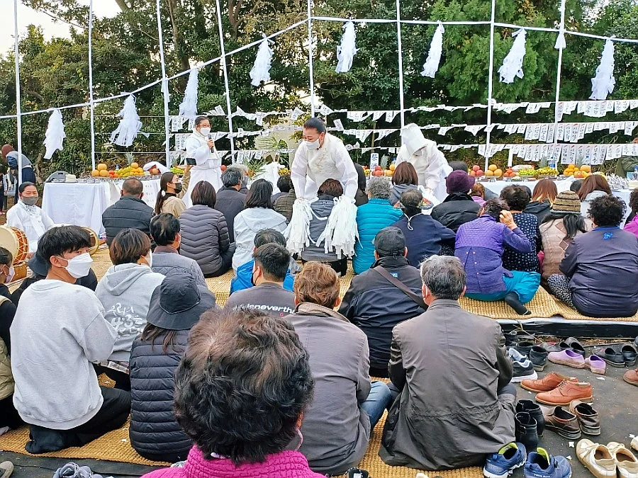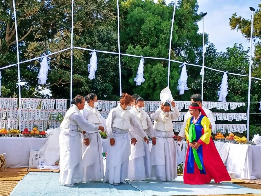 혼을 불러내 풍장 따라 모셔온 뒤 영혼이 저세상 극락정토 가도록 배웅하는 동안.