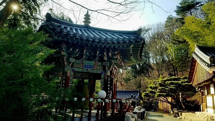 다리 건너자 좁고 길쭘한 산비탈에 청청한 대밭 주렴 되어 가린 채 대웅전, 무설전, 종각이 서로 이마 맞댈 듯 모여 앉았다.