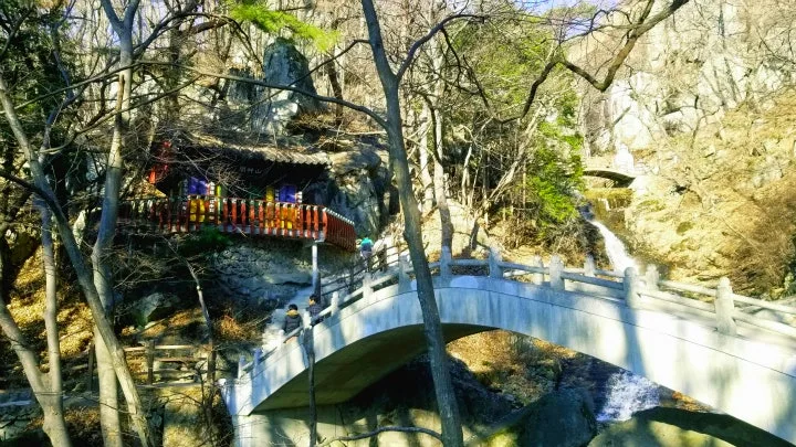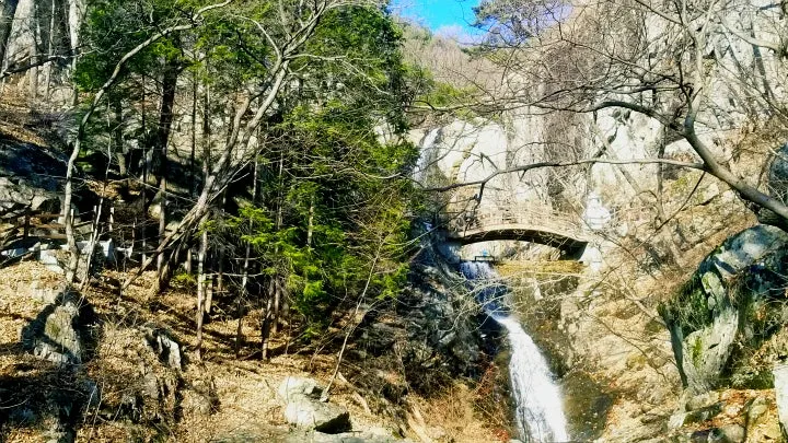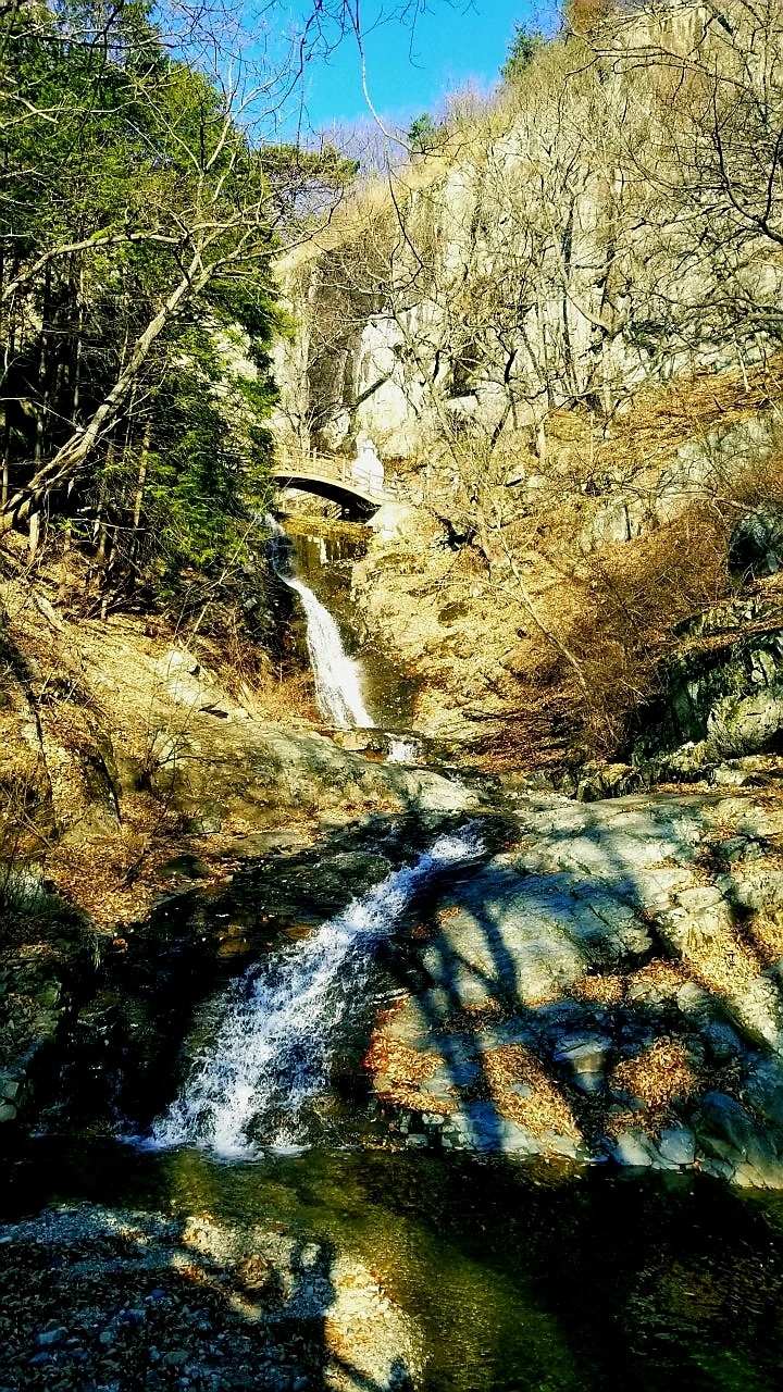 반대편 길로 하산하며 올려다보니 높이 14m인 제1폭과 10m인 제2폭으로 이루어진 홍룡폭포가 홍예교 사이로 더욱 멋스러웠다.